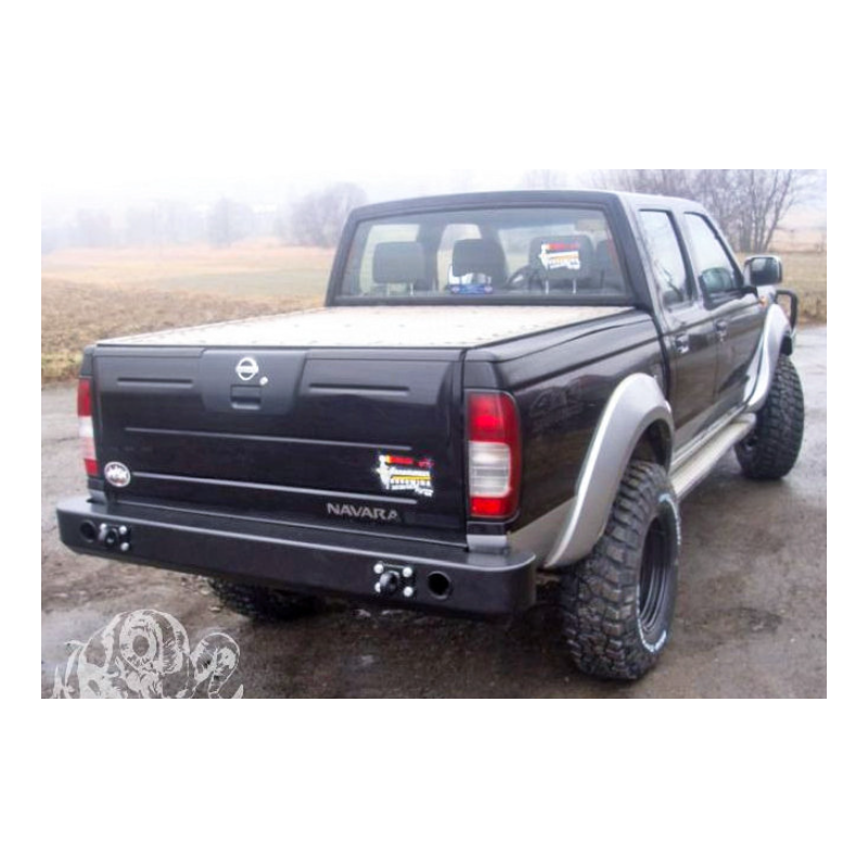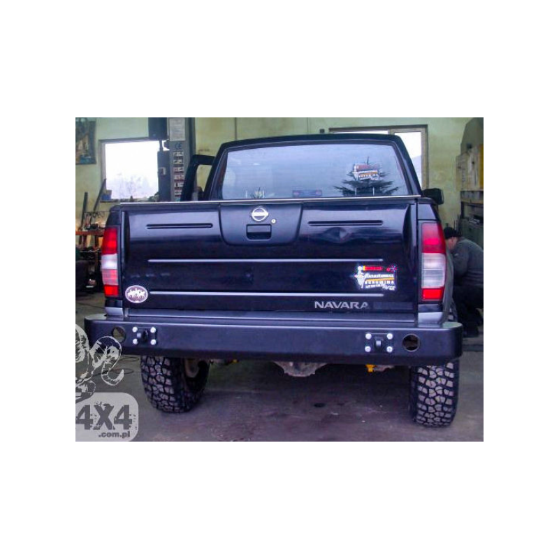 Metal (steel) rear bumper for Nissan Navara/NP300/PickUp/Frontier/Hardbody D22 2001-2004 (facelift). The bumper has openings for attaching a Hi-Lift jack and mounting holes for towing eyes a (towing eyes can be included for additional cost).