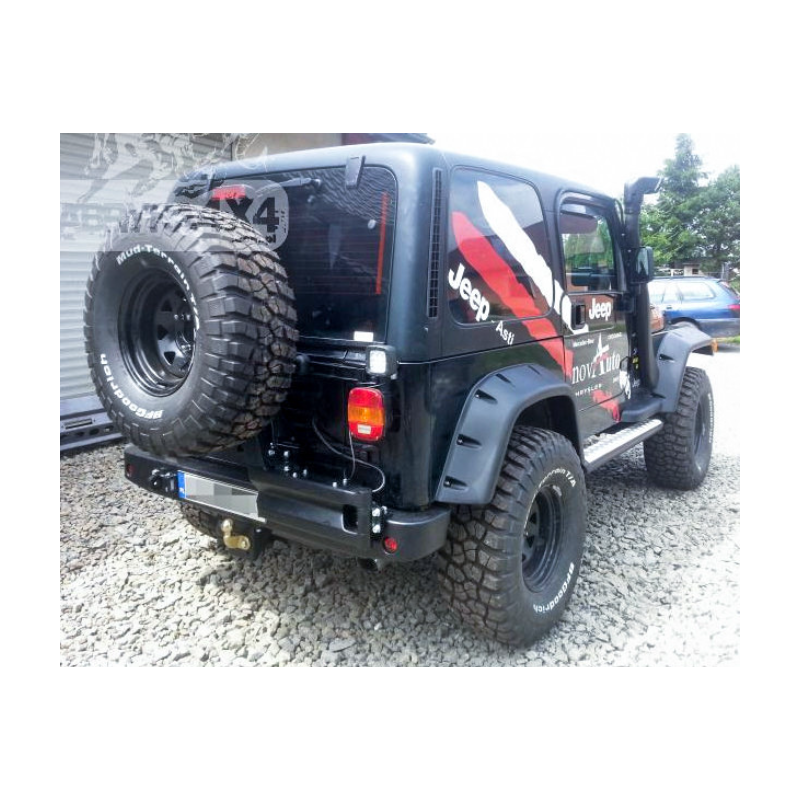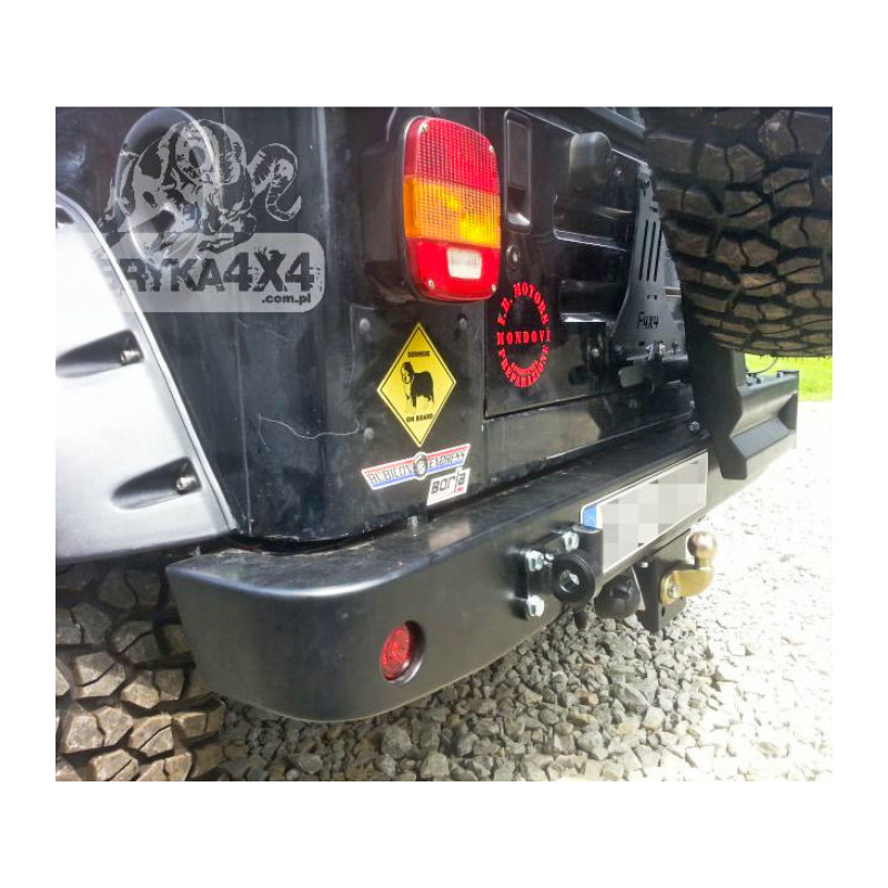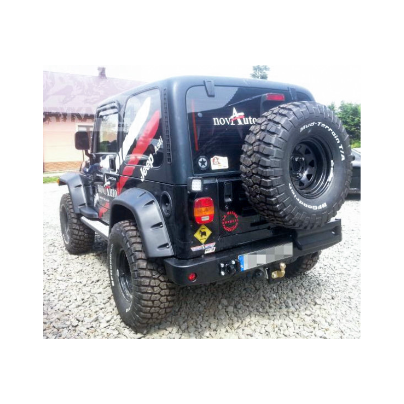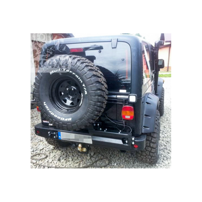 Metal (steel) rear bumper for Jeep Wrangler TJ/LJ 1997-2006. The bumper has mounting holes for towing eyes and openings to mount additional lights like brake, fog or reverse lights (towing eyes and lights can be included for additional cost).