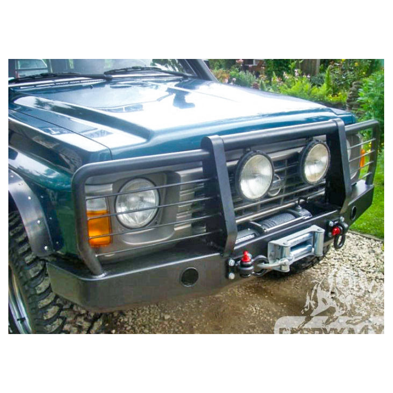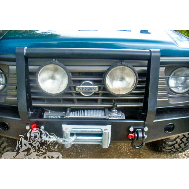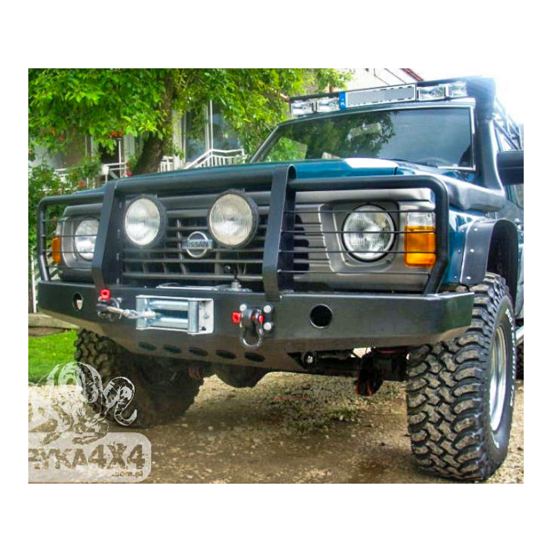 Metal (steel) front bumper with winch mounting plate for Nissan Patrol Y60 GR/GQ 1989-1998. The bumper can be ordered with a screw-on bull bar.