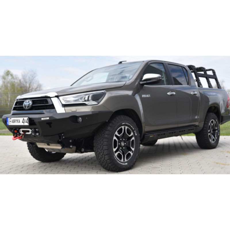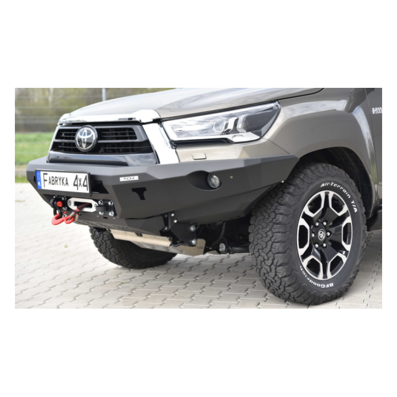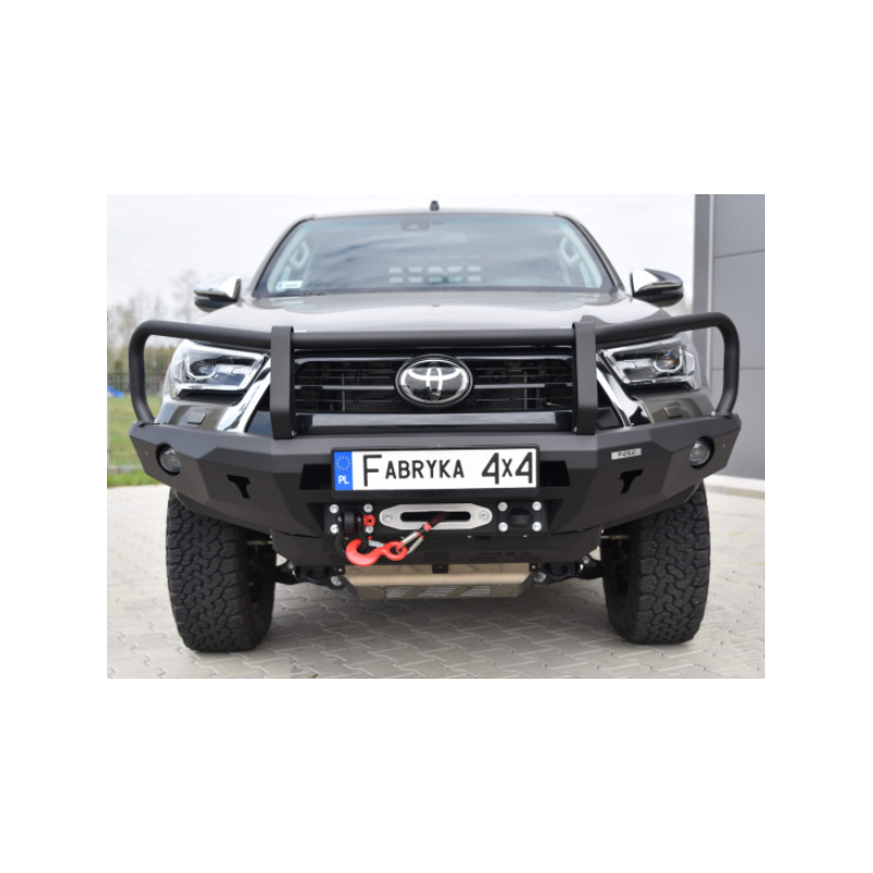 Metal (steel) front bumper with winch mounting plate for Toyota Hilux Revo AN110, AN120, AN130 2020- (2nd facelift). The bumper can be ordered with a screw-on bull bar.