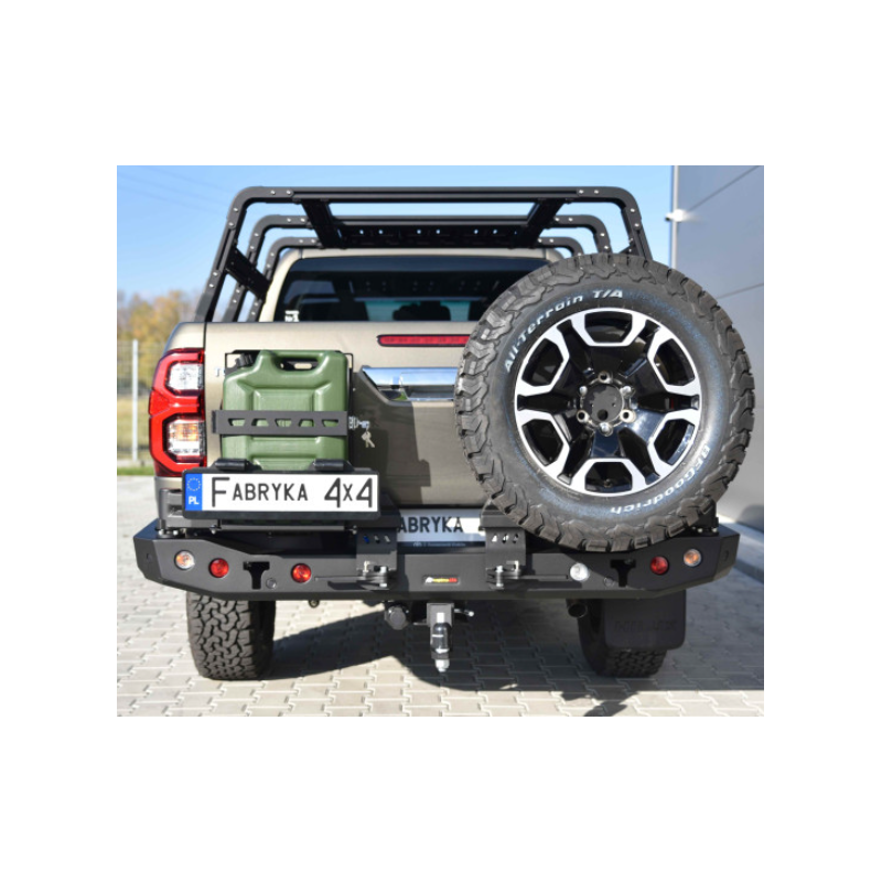 Metal (steel) long rear bumper for Toyota Hilux Revo AN110, AN120, AN130 2020- (2nd facelift). The bumper has a trailer hitch receiver and a bracket for trailer connector socket.