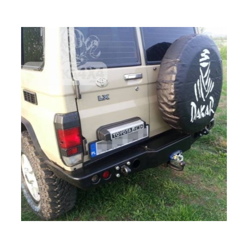Metal (steel) rear bumper with winch mounting plate for Toyota Land Cruiser HZJ 71 1999-2007. The bumper has mounting holes for towing eyes, openings for attaching a Hi-Lift jack or for mounting additional lights like brake, fog or reverse lights (towing eyes and lights can be included for additional cost).