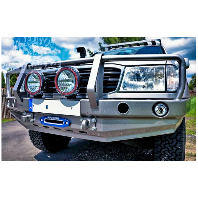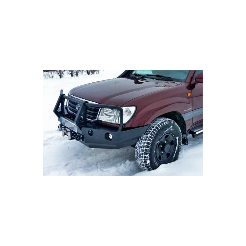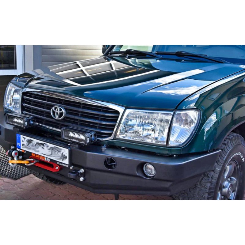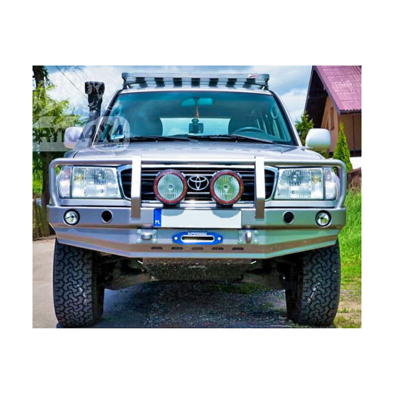 Metal (steel) front bumper with winch mounting plate for Toyota Land Cruiser J105 1998-2007. The bumper can be ordered with a screw-on bull bar.