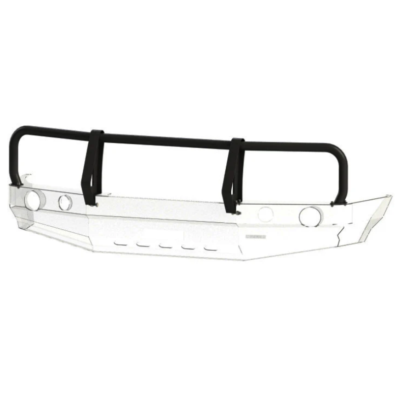 The bumper has openings for attaching a Hi-Lift jack, mounting holes for towing eyes and openings for additional daytime running lights (DRL) or fog lights (towing eyes and lights can be included for additional cost).