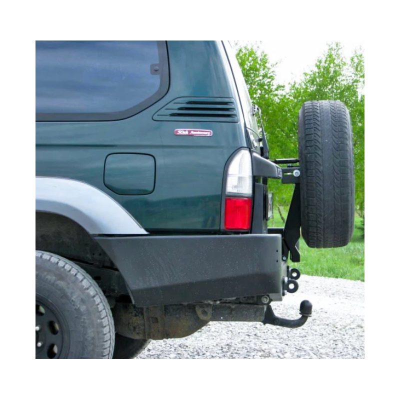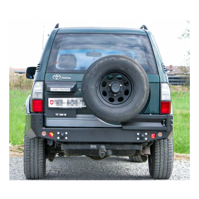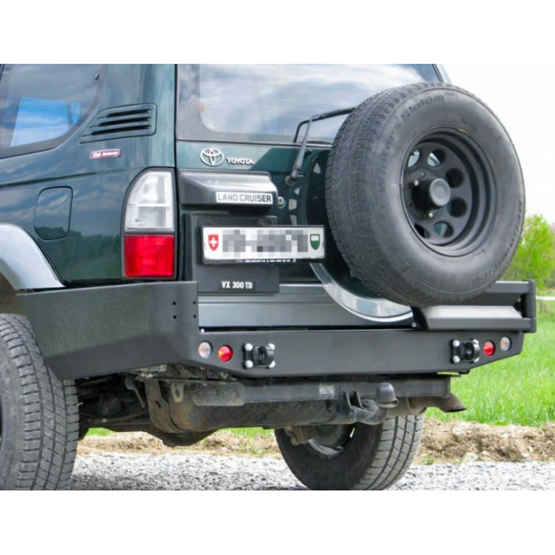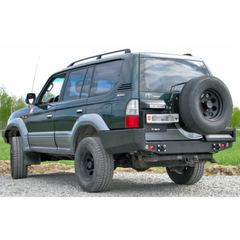 Metal (steel) rear bumper for Toyota Land Cruiser Prado J90, J95 1996-2002. The bumper has mounting holes for towing eyes and openings for mounting additional lights like brake, fog or reverse lights (towing eyes and lights can be included for additional cost).