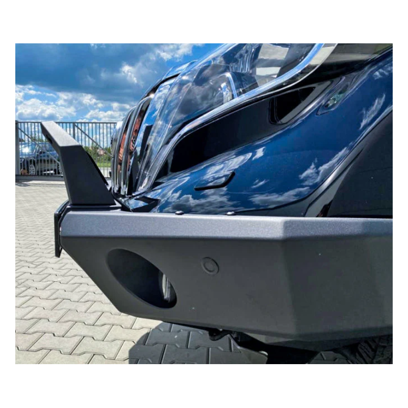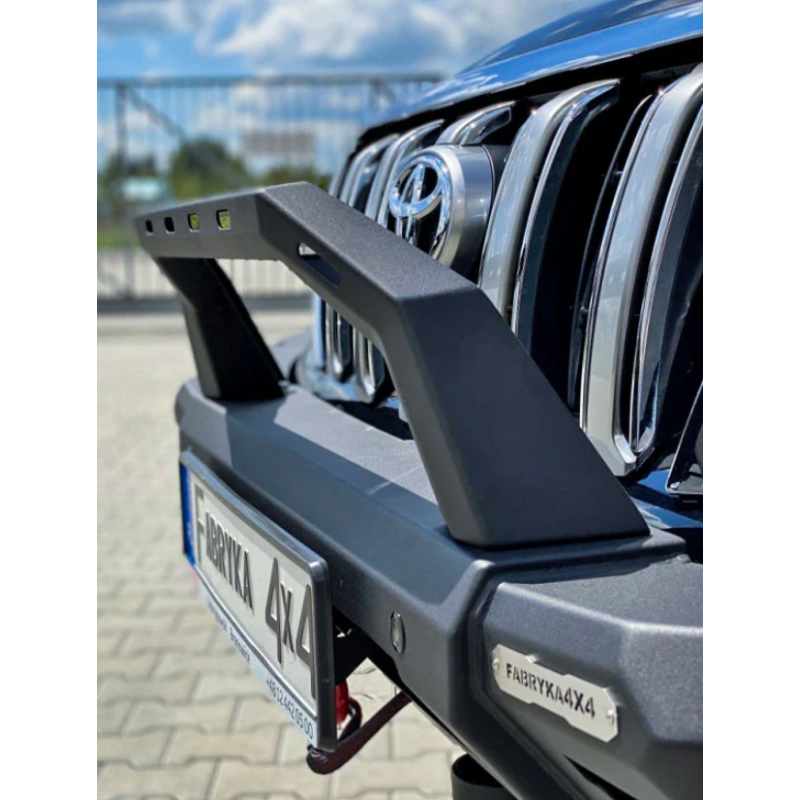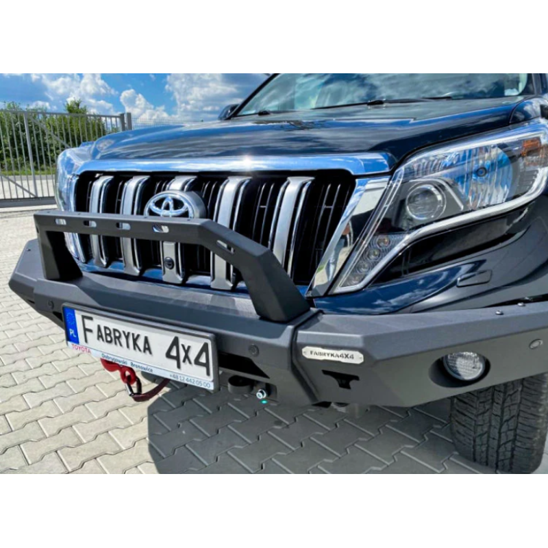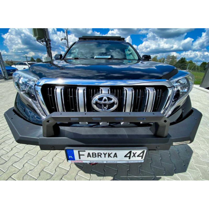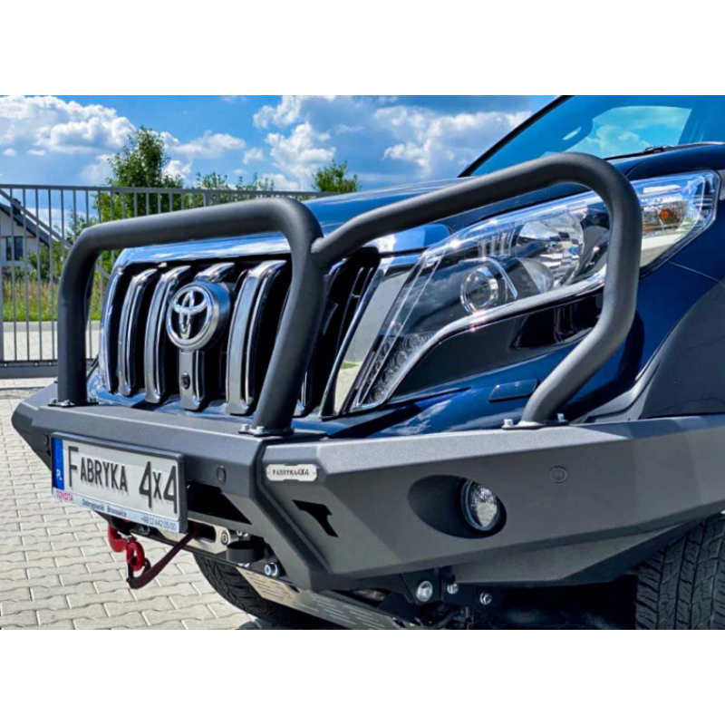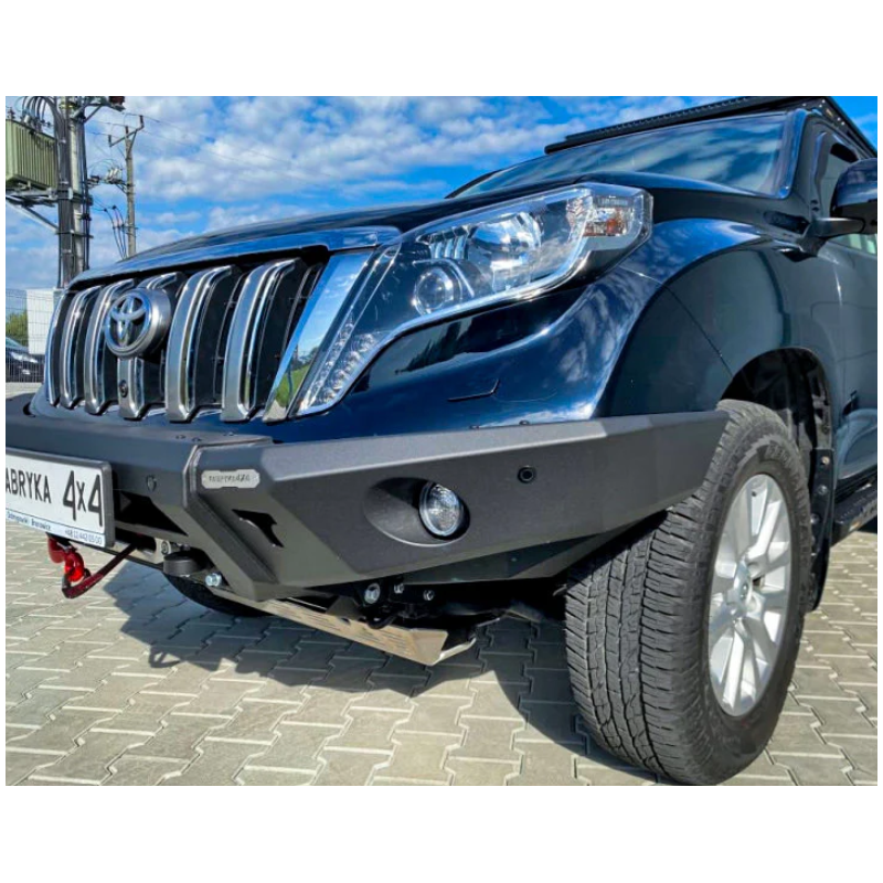 Metal (steel) front bumper with winch mounting plate for Toyota Land Cruiser Prado J150, J155 (adaptable for Lexus GX 460) 2013-2017 (1st facelift). The bumper can be ordered with a screw-on partial or full bull bar (specify the desired version when ordering).