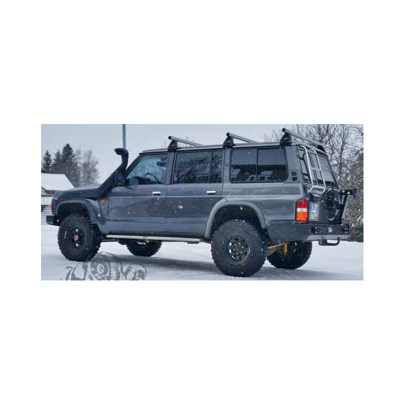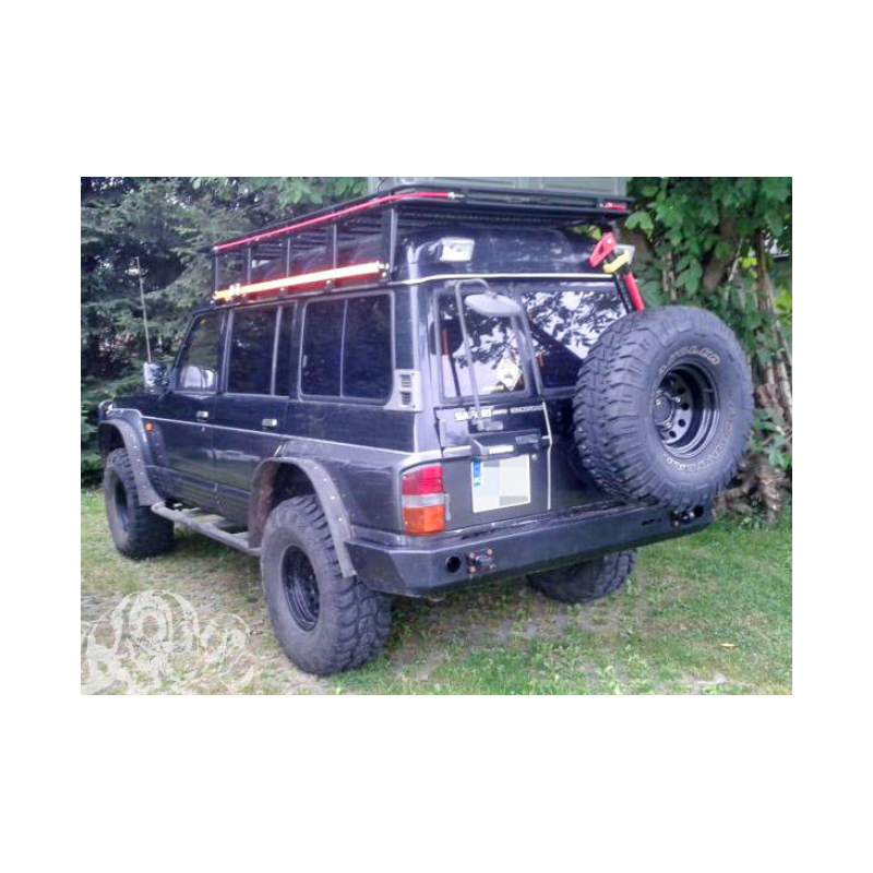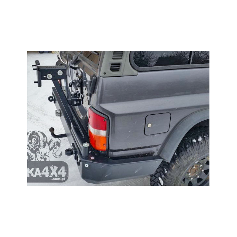 Metal (steel) rear bumper for Nissan Patrol Y60 1989-1998. The bumper has mounting holes for towing eyes and openings for attaching a Hi-Lift jack (towing eyes can be included for additional cost).