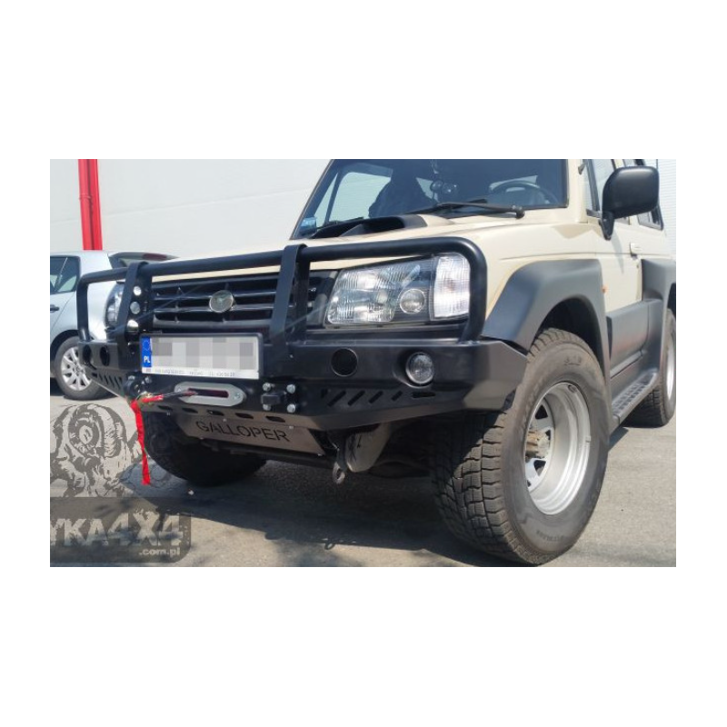 Metal (steel) front bumper with winch mounting plate for Hyundai Galloper Innovation 1997-2004. The bumper can be ordered with a screw-on bull bar.