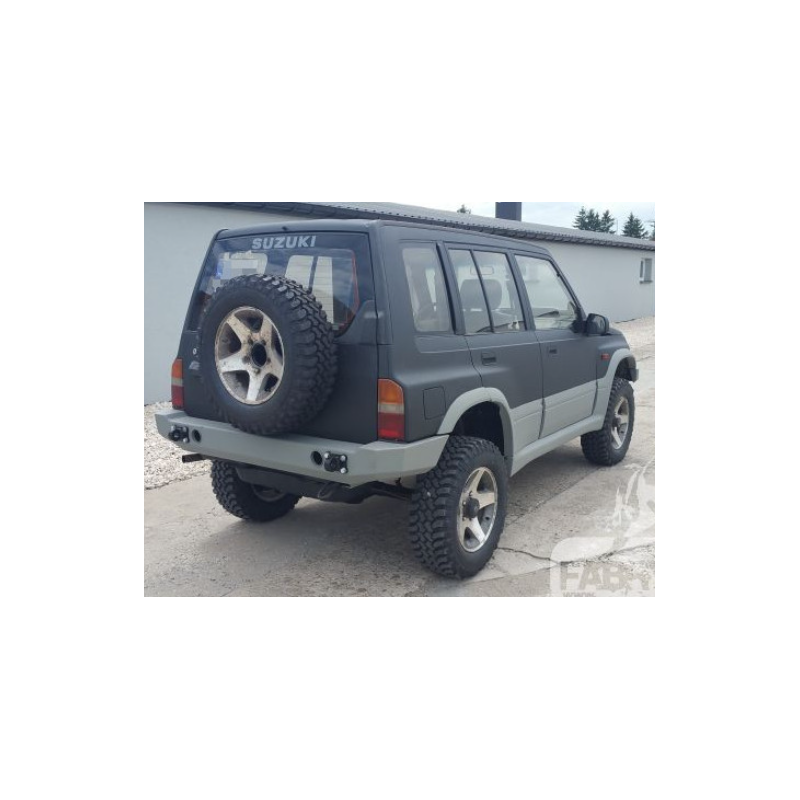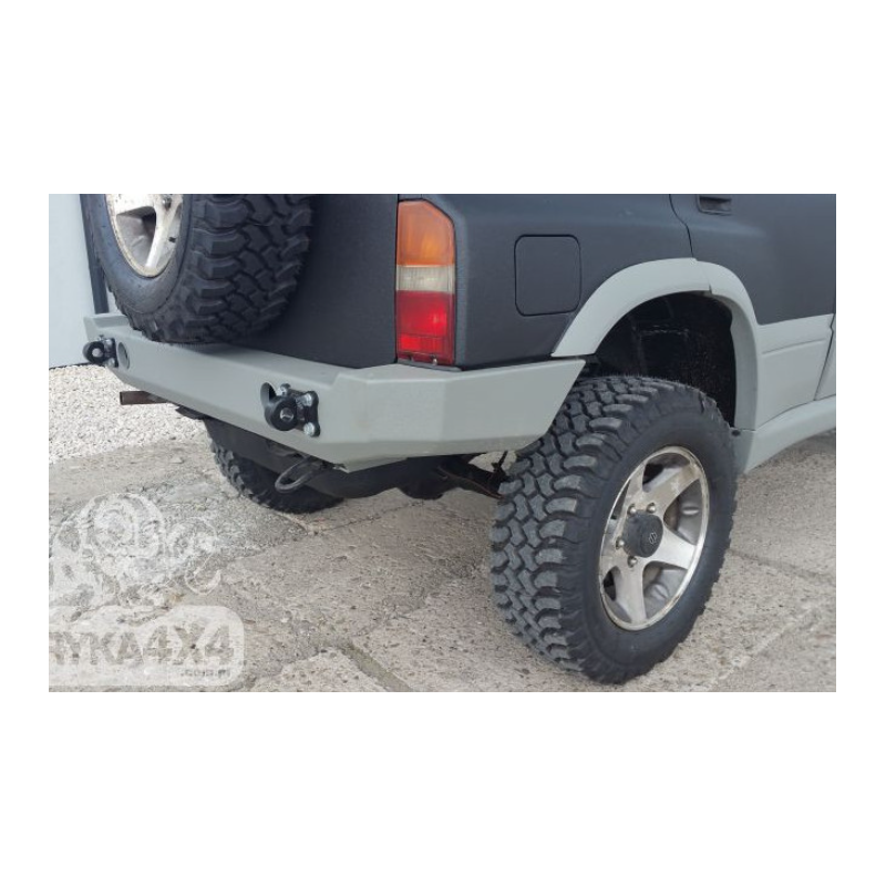 Metal (steel) rear bumper for Suzuki Vitara ET/TA 2.0 V6 1988-1999. The bumper has mounting holes for towing eyes and openings for attaching a Hi-Lift jack (towing eyes can be included for additional cost).