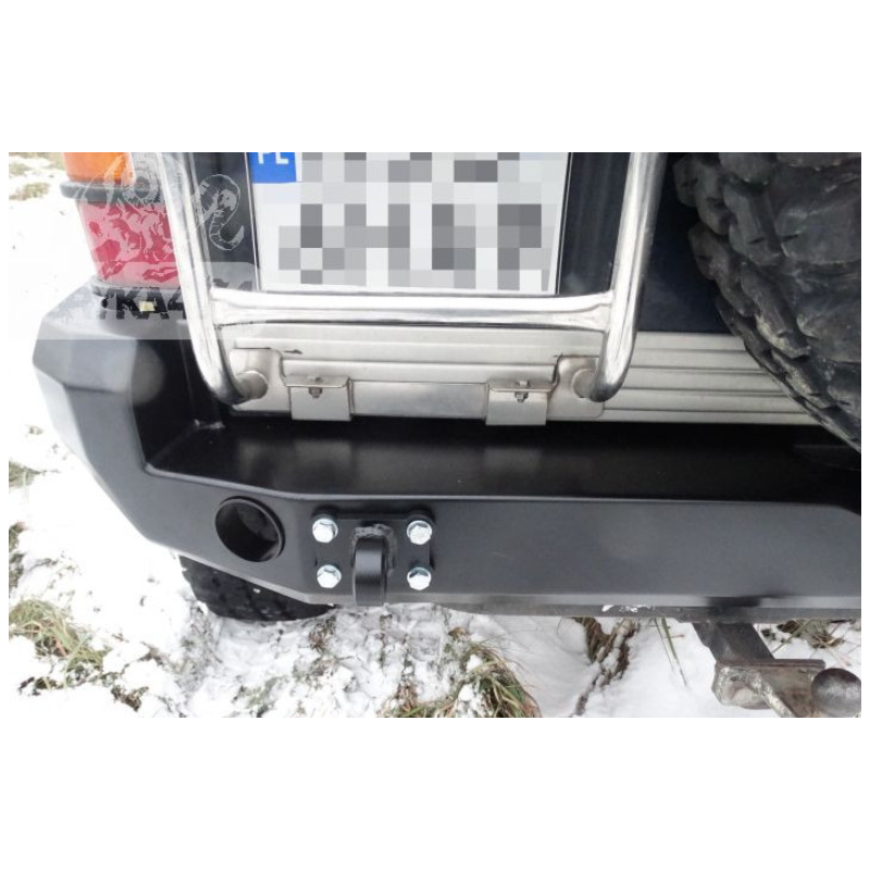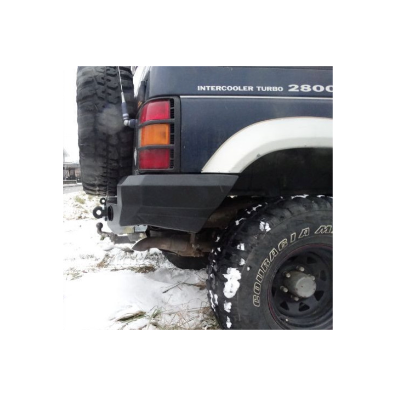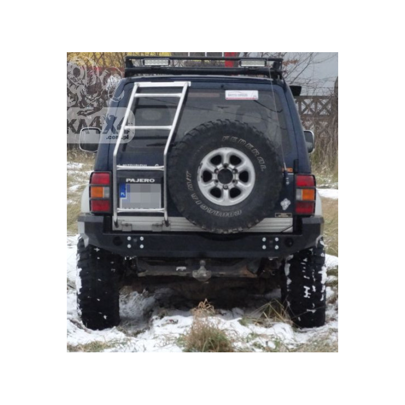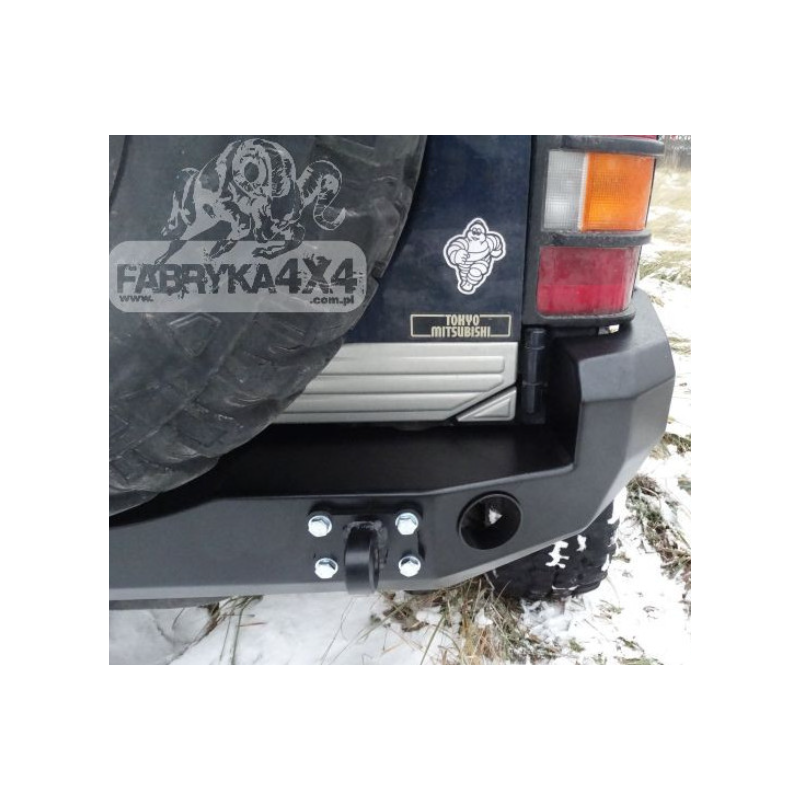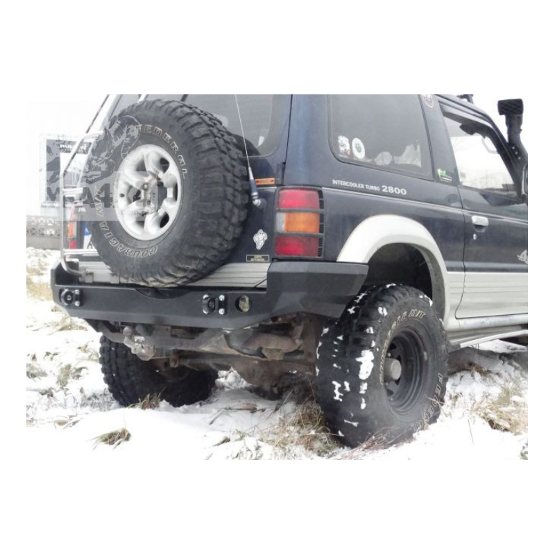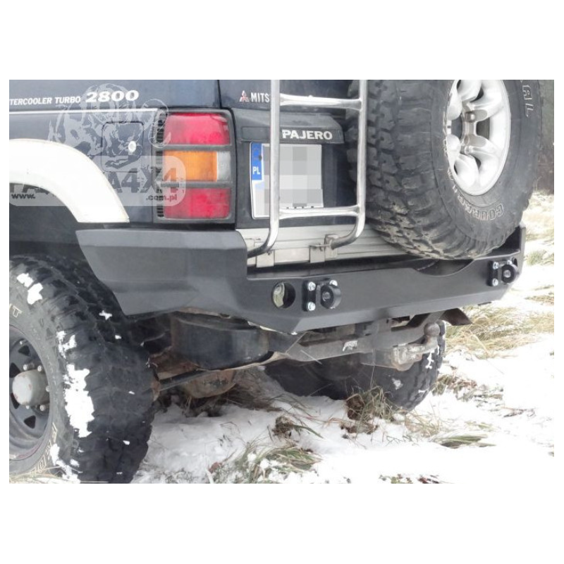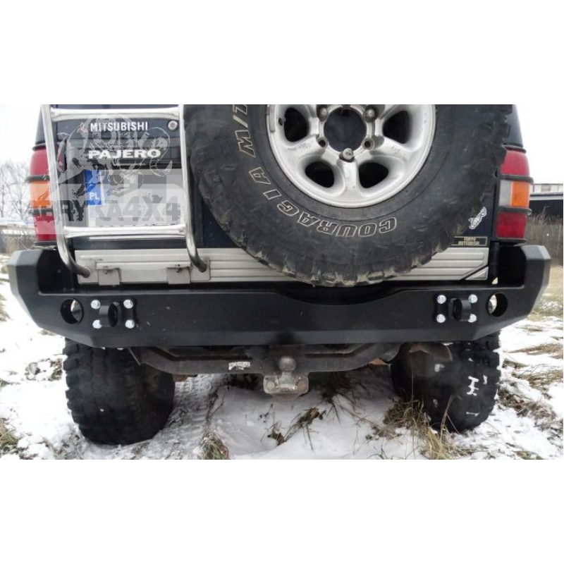 Metal (steel) rear bumper for Mitsubishi Pajero/Montero/Shogun II V20/V30/V40 1991-1999 (with fender flares). The bumper has mounting holes for towing eyes and openings for attaching a Hi-Lift jack (towing eyes can be included for additional cost).