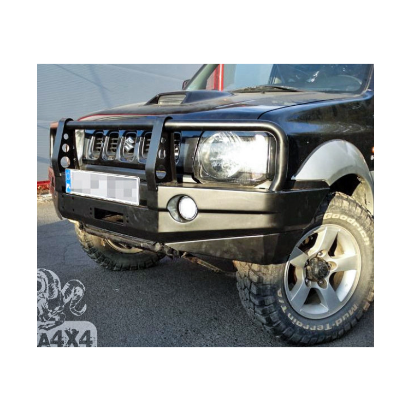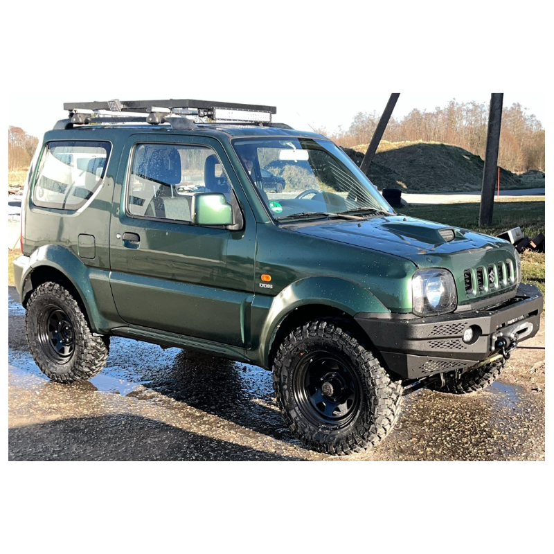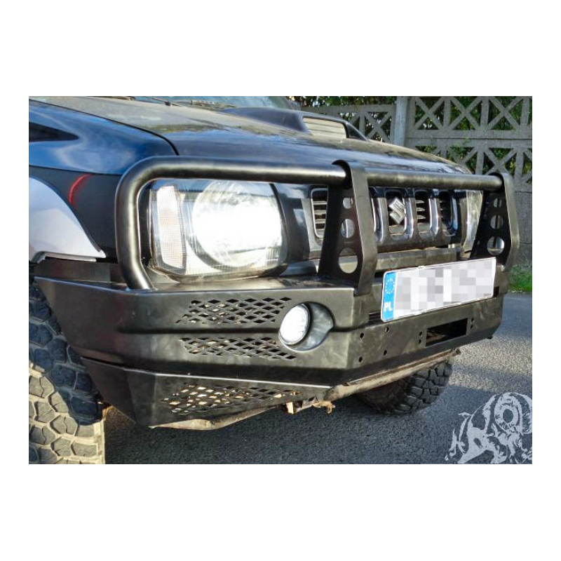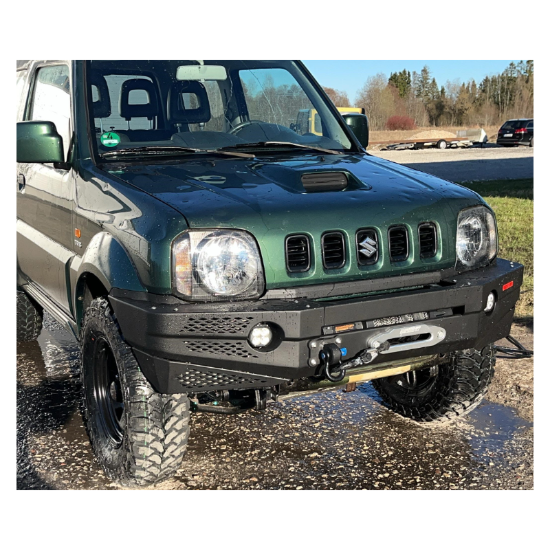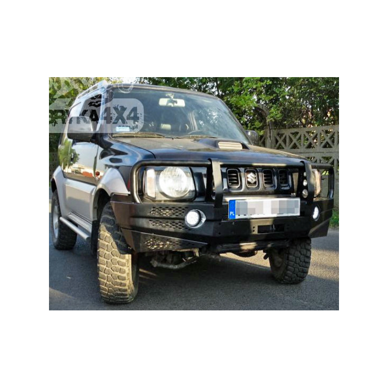 Metal (steel) front bumper with winch mounting plate for Suzuki Jimny III DDiS (dyzelis) JB53/SN415 2003-2012. The bumper can be ordered with a screw-on bull bar.