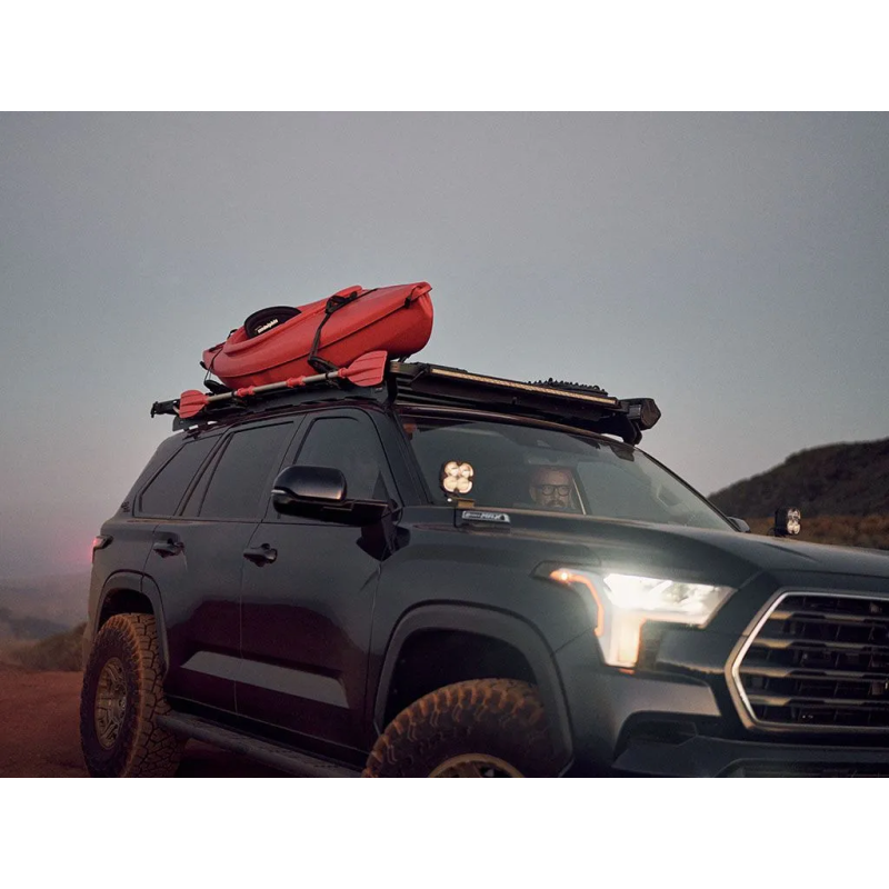 Brackets for mounting additional lighting above hood - bonnet at the A-Pillar of Toyota Tundra, Sequoia 2021-. Brackets attach to the hood latch using existing factory bolts, eliminating the need for drilling holes or modifying the vehicle.