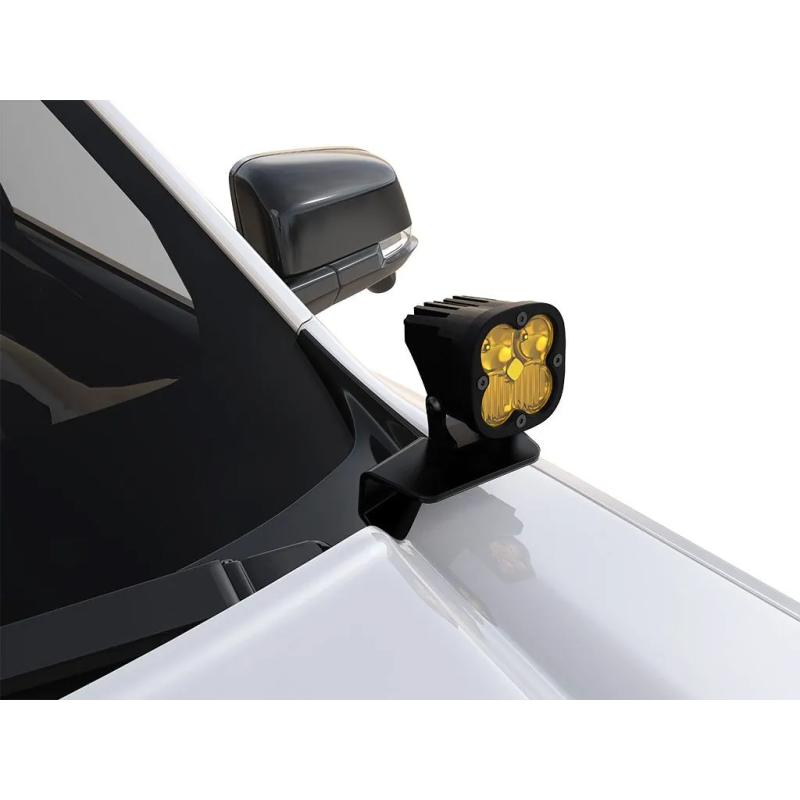 Brackets for mounting additional lighting above hood - bonnet at the A-Pillar of Ford Ranger 2019-2022. Brackets attach to the hood latch using existing factory bolts, eliminating the need for drilling holes or modifying the vehicle.