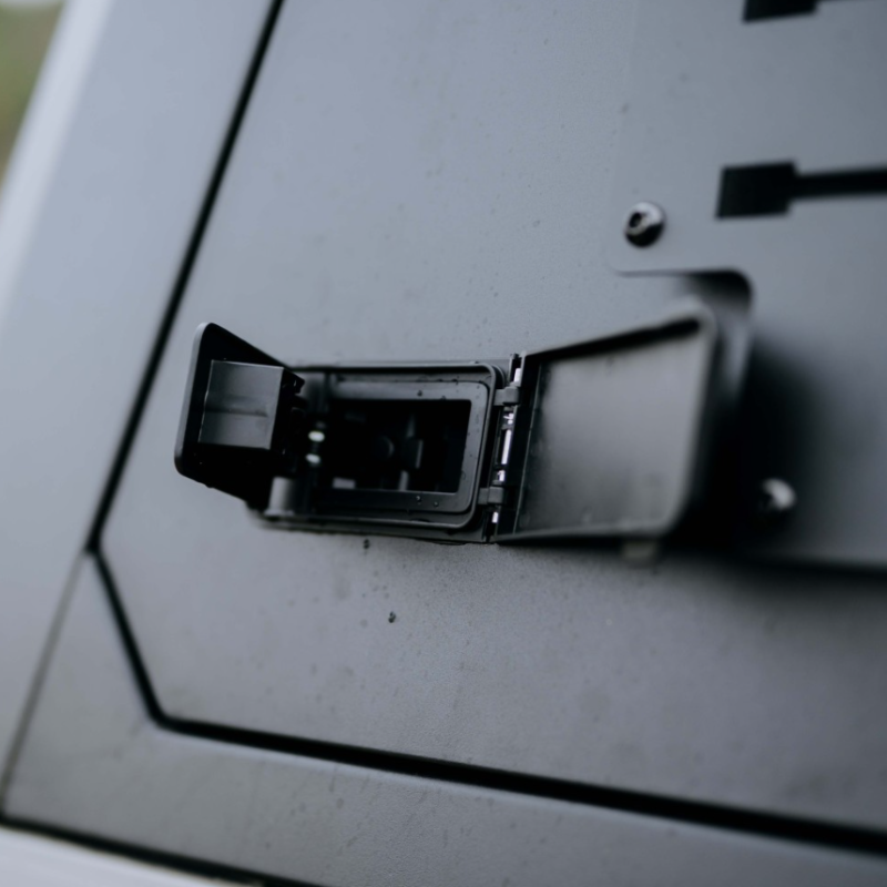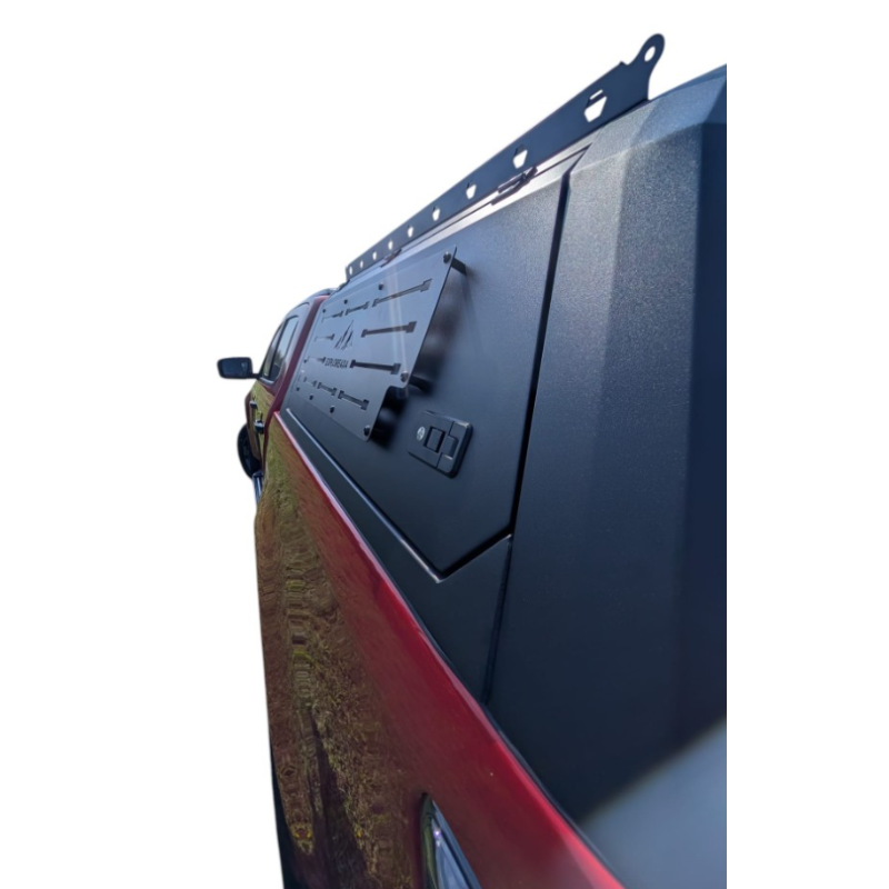 The Explore 4x4 steel expedition hardtop canopy is well-designed and solidly constructed. It is painted using the E-coating method in matt black. It has lockable side flaps and a lockable glazed rear flap that can be locked from inside. The front panel is equipped with ventilation, which prevents the creation of negative pressure during driving that would suck dust and dirt inside. The gas struts, locks and hinges are strong and designed to serve for a long time without any problems. Hardtop is equipped with a brake light, interior lighting and rails that facilitate the installation of additional accessories such as a roof tent.