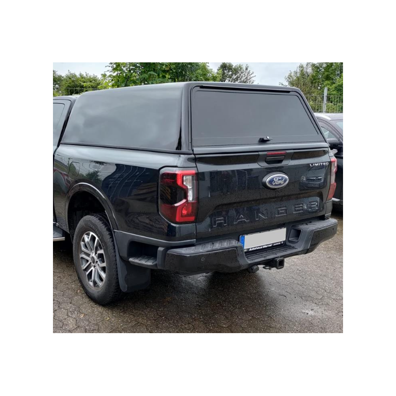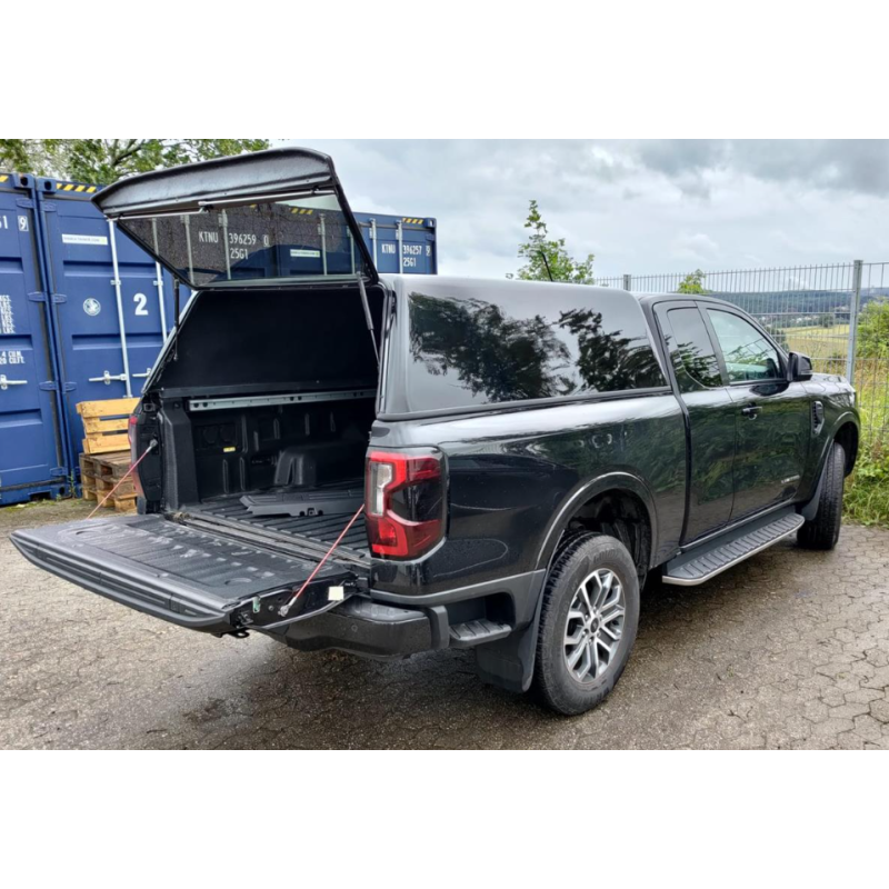 Pickup truck bed hardtop canopy for Ford Ranger IV T9 P703/RA Extended Cab (Super Cab) 2022- (XL, XLT, Limited, Wildtrak). This hardtop is the perfect solution for outdoor adventure enthusiasts and workers who need reliable and functional equipment. Due to the single-shell construction, this hardtop is extremely stable in relation to its weight.
