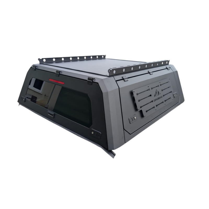 The Explore 4x4 steel expedition hardtop canopy is well-designed and solidly constructed. It is painted using the E-coating method in matt black. It has lockable side flaps and a lockable glazed rear flap that can be locked from inside. The front panel is equipped with ventilation, which prevents the creation of negative pressure during driving that would suck dust and dirt inside. The gas struts, locks and hinges are strong and designed to serve for a long time without any problems. Hardtop is equipped with a brake light, interior lighting and rails that facilitate the installation of additional accessories such as a roof tent.