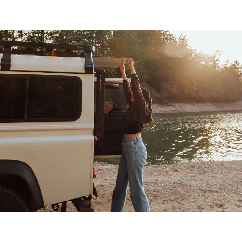 Roof rack is made from black epoxy powder coated T6 aluminum profiles (slats) and high strength steel. The roof rack can be equipped with various Front Runner brackets for attaching items to the top or sides of the roof rack (ordered separately). It is also possible to attach other various brackets or objects to the slats with 8 mm bolts.