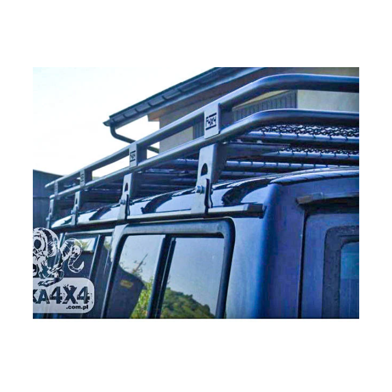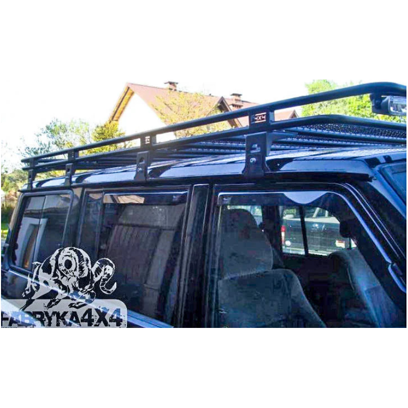 Roof Rack for Nissan Patrol Y60 GR/GQ 1989-1998. Designed for transporting various light and heavy luggage, overlanding, expeditions or setting up a hunting platform by installing a plywood or aluminium floor. The roof rack has mounting spaces for vehicle registration plates and additional lights (front, sides, rear). Lights are ordered separately.