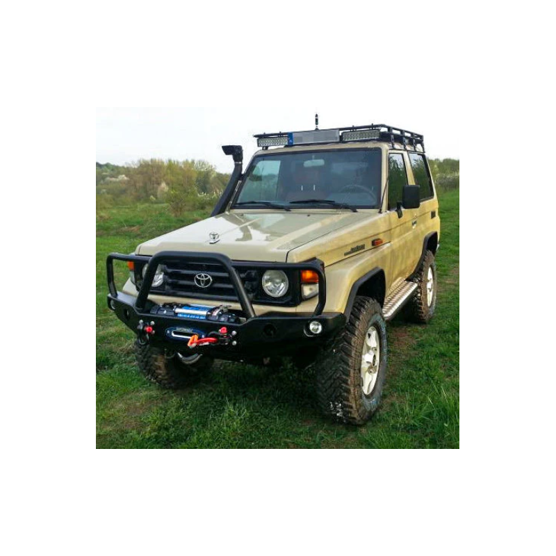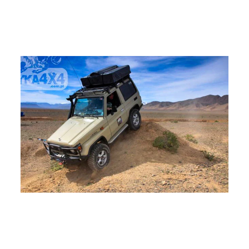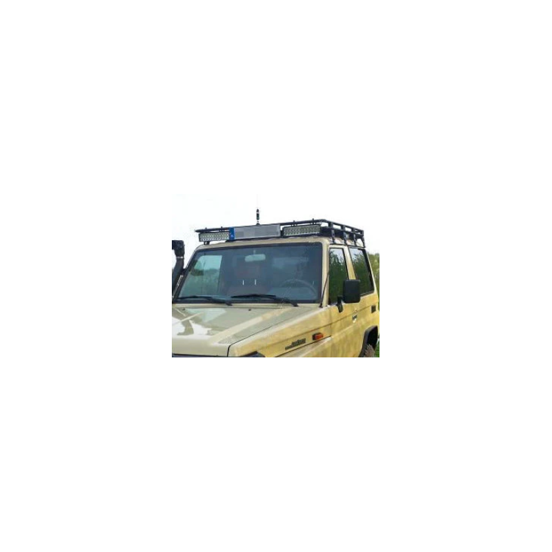 Roof Rack for Toyota Land Cruiser HZJ 71. Designed for transporting various light and heavy luggage, overlanding, expeditions or setting up a hunting platform by installing a plywood or aluminium floor. The roof rack has mounting spaces for vehicle registration plates and additional lights (front, sides, rear). Lights are ordered separately.
