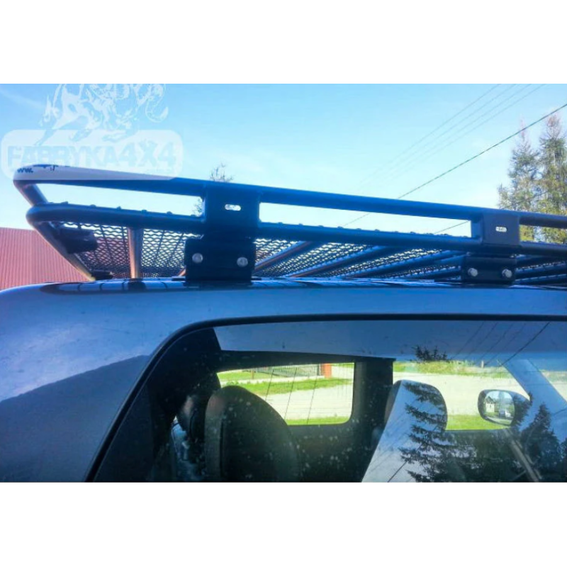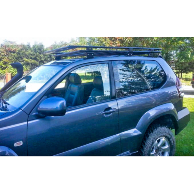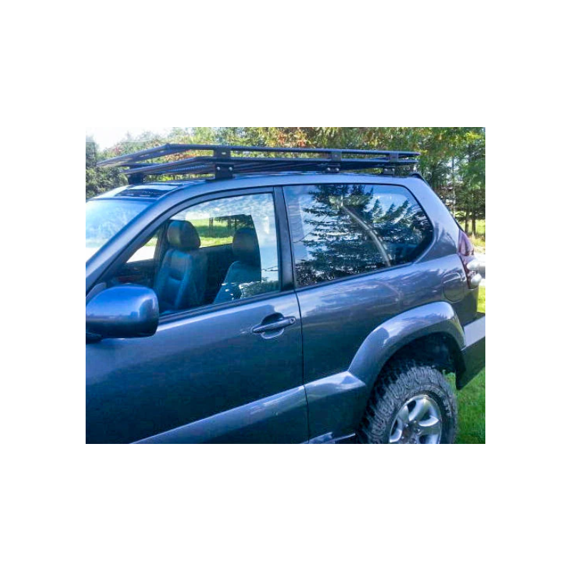 Roof Rack for Toyota Land Cruiser Prado J120, J125, Lexus GX 470 2002-2009. Designed for transporting various light and heavy luggage, overlanding, expeditions or setting up a hunting platform by installing a plywood or aluminium floor. The roof rack has mounting spaces for vehicle registration plates and additional lights (front, sides, rear). Lights are ordered separately.
