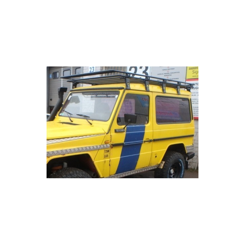 Roof Rack for Mercedes-Benz G-Class. Designed for transporting various light and heavy luggage, overlanding, expeditions or setting up a hunting platform by installing a plywood or aluminium floor. The roof rack has mounting spaces for vehicle registration plates and additional lights (front, sides, rear). Lights are ordered separately.