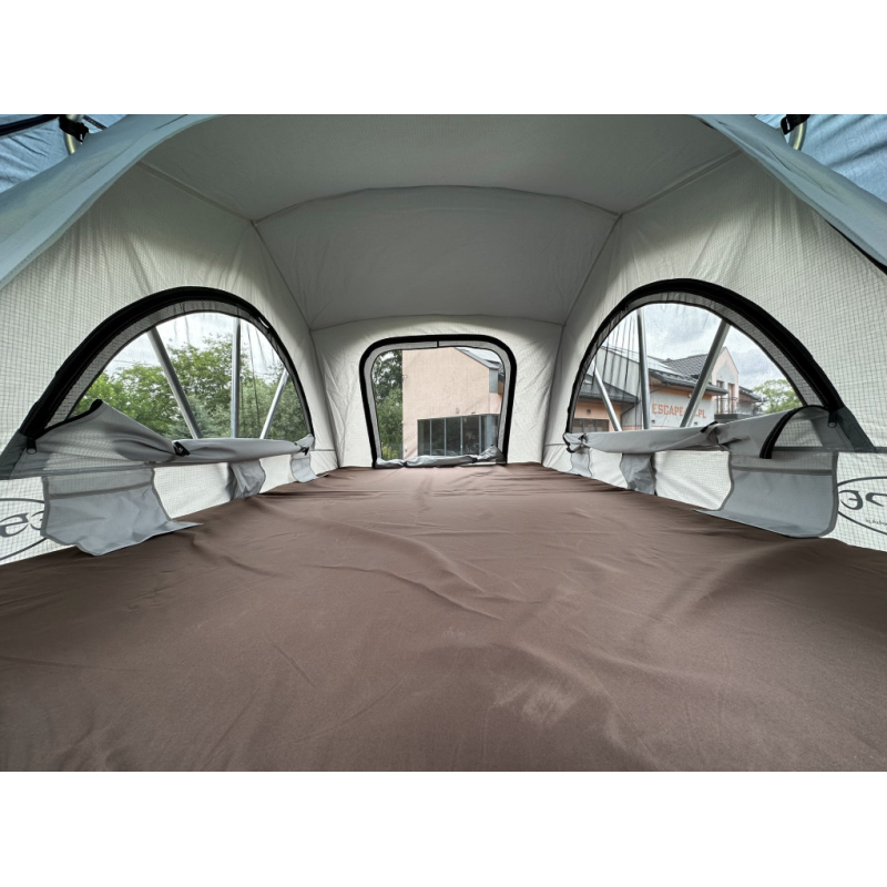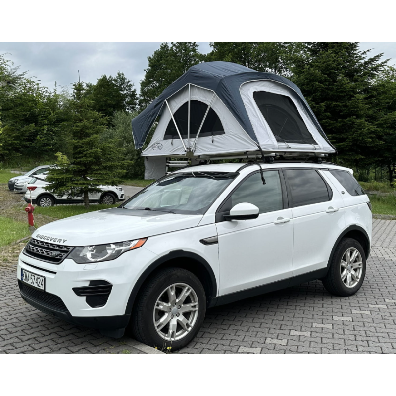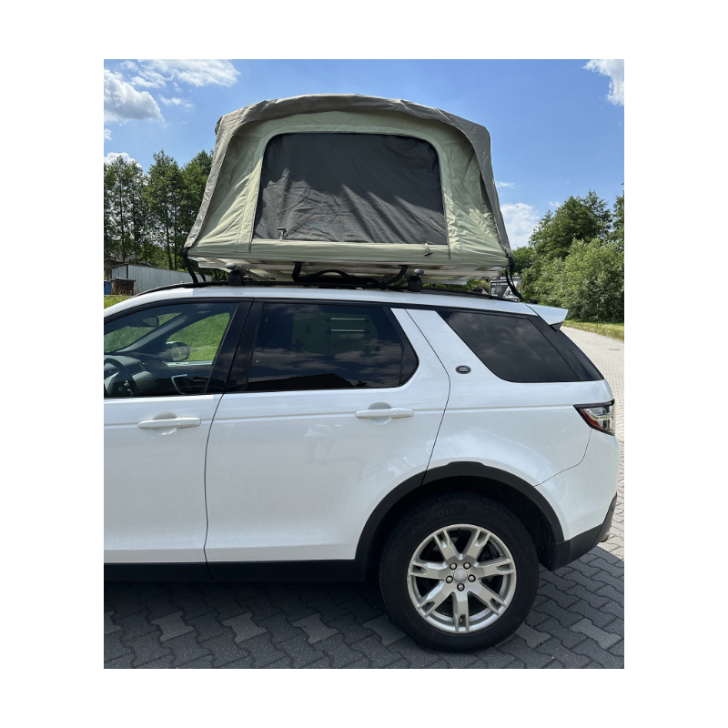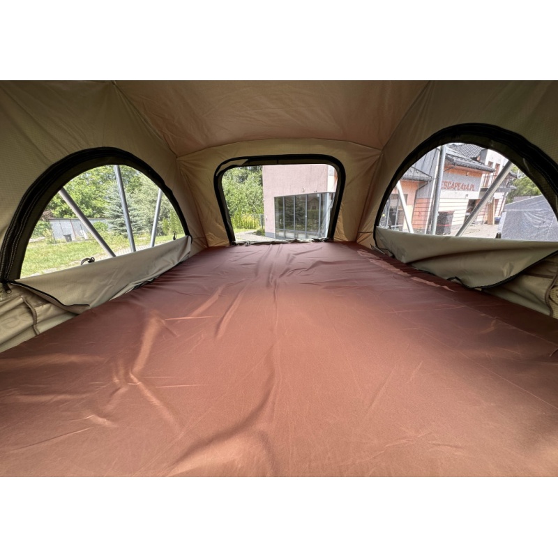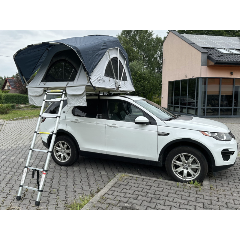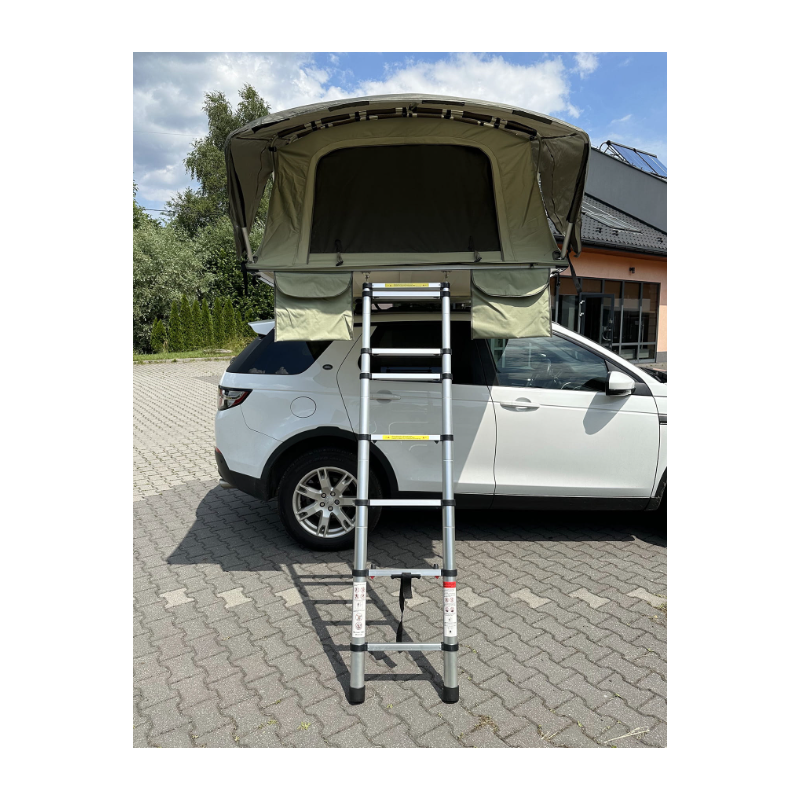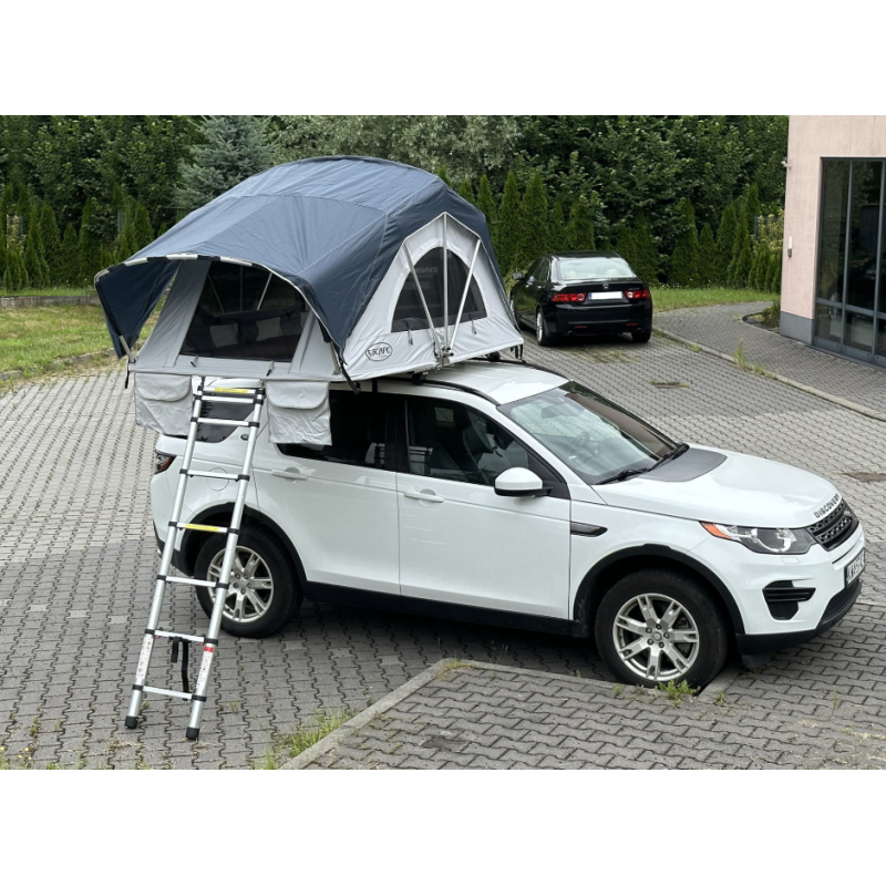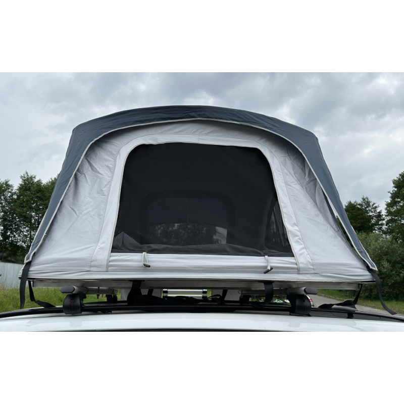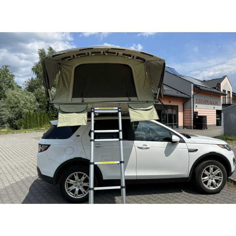 Rooftop tent Arizona II 190 (5 people) is designed to be installed on car roof racks or railings. Tent's flysheet is made of Oxford 420D polyester and 280D polyester, ensuring it's water resistance. 70 mm thick cotton coated mattress is filled with high density foam. Mosquito nets are placed inside the tent. The two-ply tent floor is made of aluminium, ferrules and screws which are made of stainless steel. The weather skirt, waterproof dust-protecting cover and aluminium adjustable ladder are included.