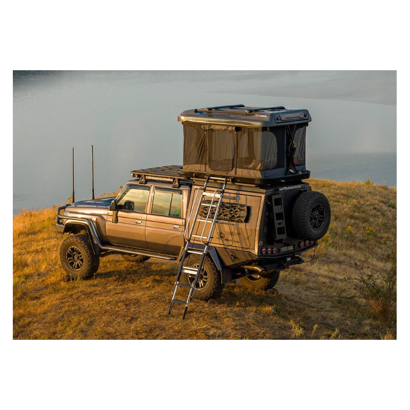 - premium aluminium ladder attachment rails blended into the shell via injection moulded end caps with under rail recessed dual temperature LED lighting (white/amber) ideal for illuminating the ladder at night or ambient campsite lighting