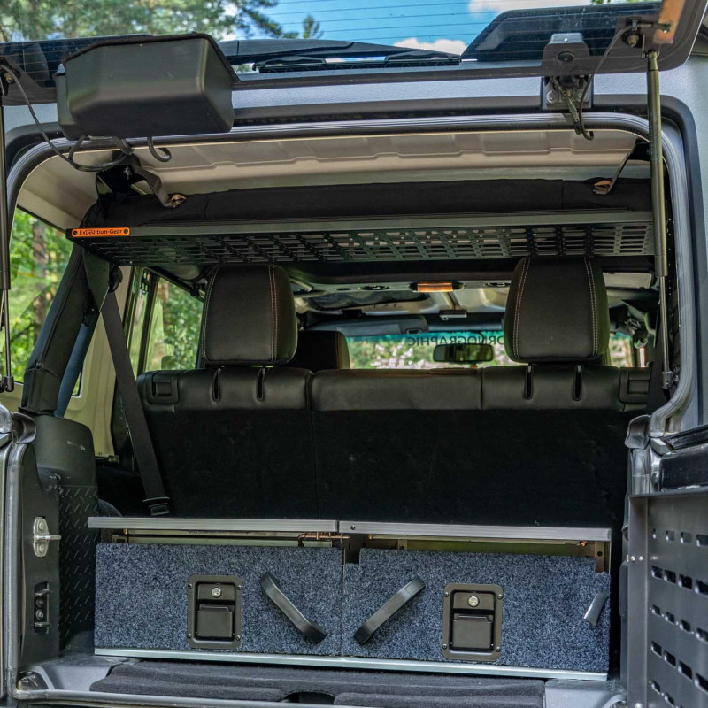 Jeep Wrangler JKU 2006-2018 (5 doors) Molle Panel storage shelf made of steel. Designed for convenient fastening and transportation of various items inside the cabin in the ceiling, which can be fastened with brackets, belts, screws. The shelf is attached to the ceiling with brackets to the handle attachment points, no additional drilling is required.