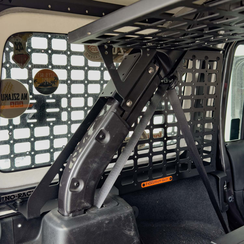 Jeep Wrangler JLU 2018- (5 door) internal window Molle panels have been designed to increase the possibilities of car space organization. They protect the windows from luggage inside and protects the luggage in case of a break in from outside. They enable the attachment of pockets and the installation of various accessories.