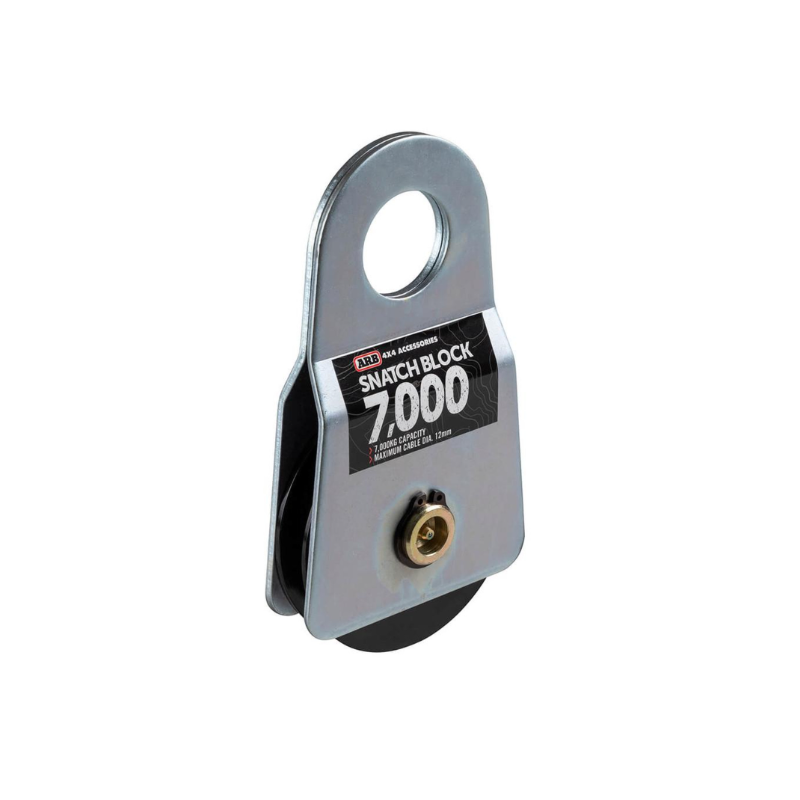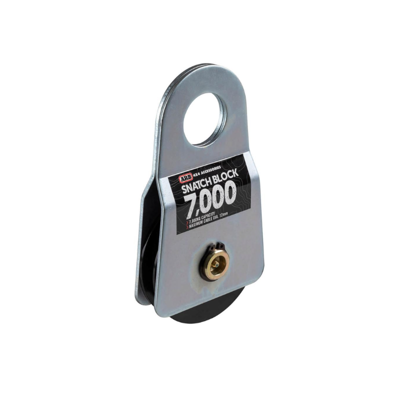 The ARB 7000 kg snatch block features side plates that sit snug against the pulley, eliminating the possibility of the winch cable becoming trapped between the pulley and the side plates. The groove on the pulley itself tapers down to the center allowing for a variety of cable sizes (1/4-1/2)/(6-12 mm) to be used and ensures the cable/rope is seated securely in the pulley, minimizing lateral movement. A snatch block is an extremely useful accessory for a winch, because it can be used to increase the winch's pulling force or change the direction of pull.