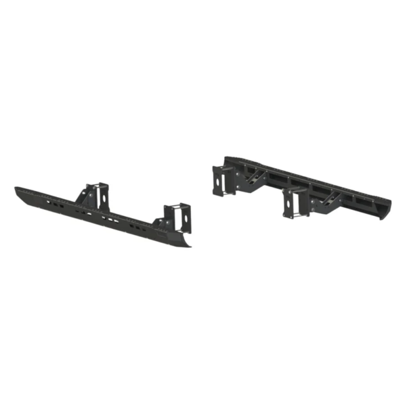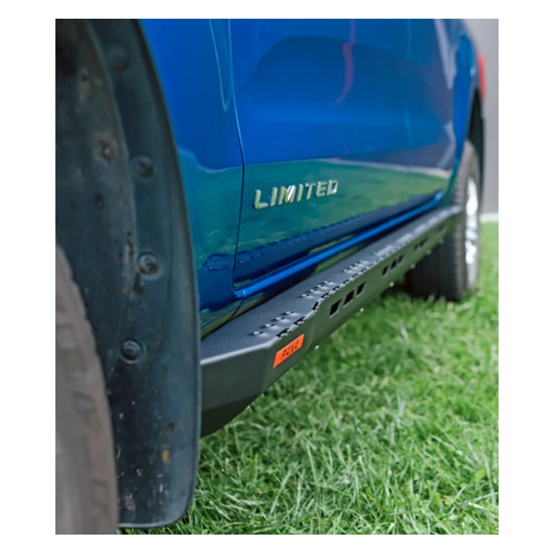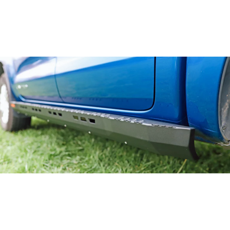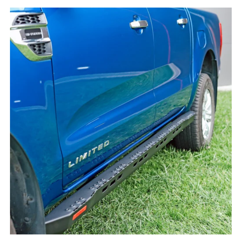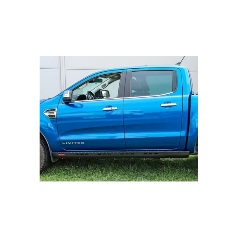 Reinforced metal (steel) side steps/rock sliders for Ford Ranger T8/PX3 2019-2022. Step Sliders allow to lift your car with Hi-Lift jacks. Step Sliders protect your car from branches, rocks and other obstacles. Step Sliders also help to get in and get out of the car, perforated surface protects from slipping.