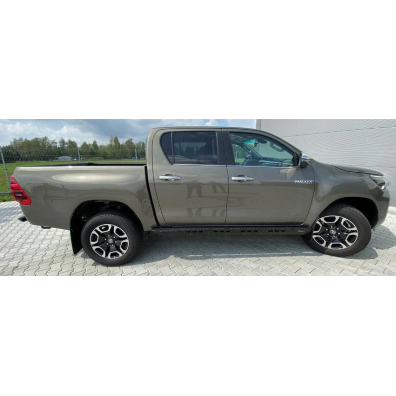 Reinforced metal (steel) side steps/rock sliders for Toyota Hilux Revo AN110, AN120, AN130 2020- (2nd facelift). Step Sliders allow to lift your car with Hi-Lift jacks. Step Sliders protect your car from branches, rocks and other obstacles. Step Sliders also help to get in and get out of the car, perforated surface protects from slipping.