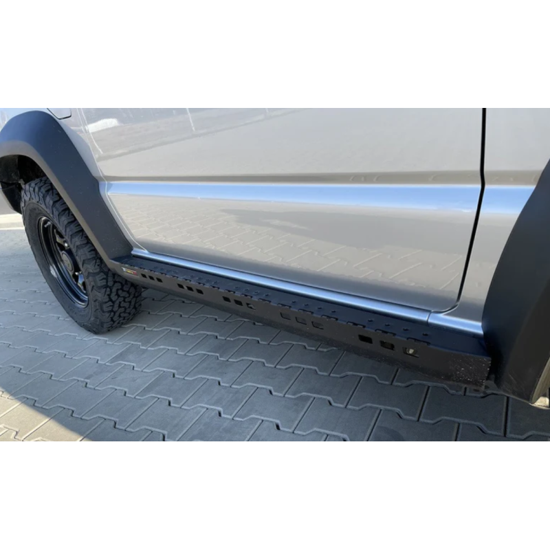 Reinforced metal (steel) side steps/rock sliders for Suzuki Jimny IV JB74W 2020-. Step Sliders allow to lift your car with Hi-Lift jacks. Step Sliders protect your car from branches, rocks and other obstacles. Step Sliders also help to get in and get out of the car, perforated surface protects from slipping.
