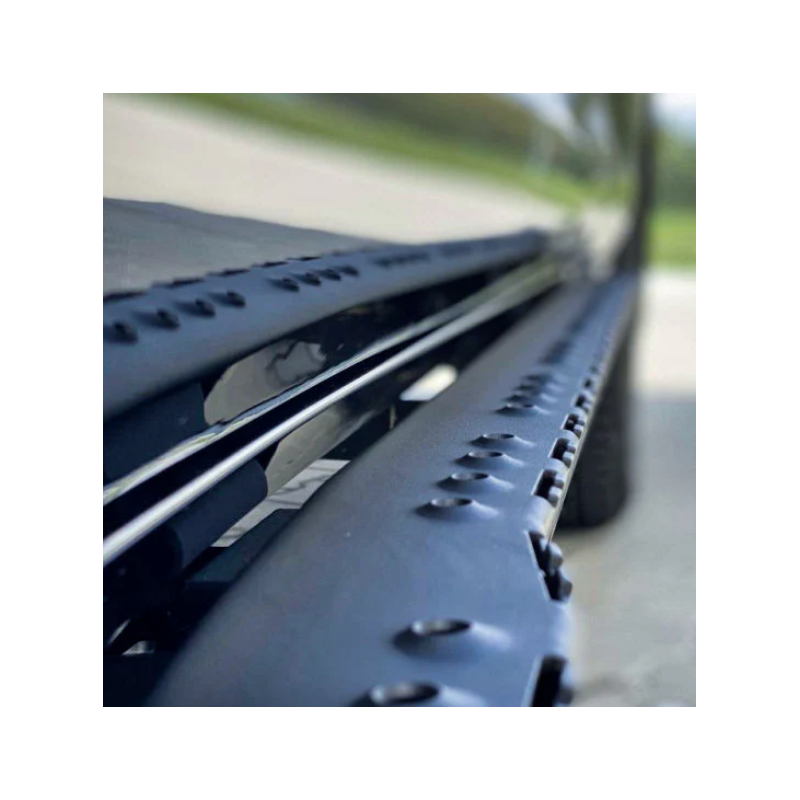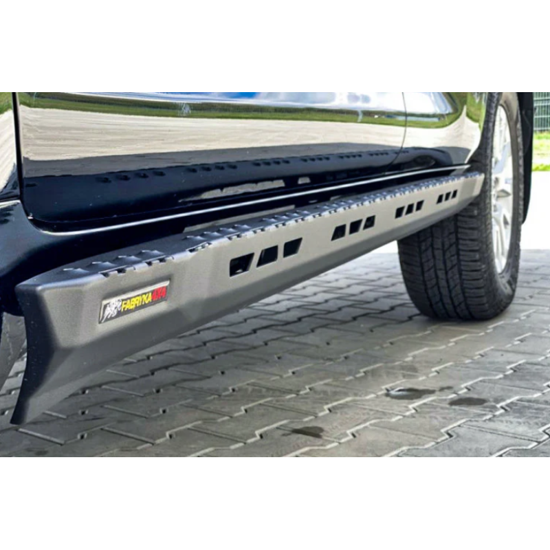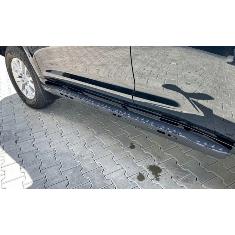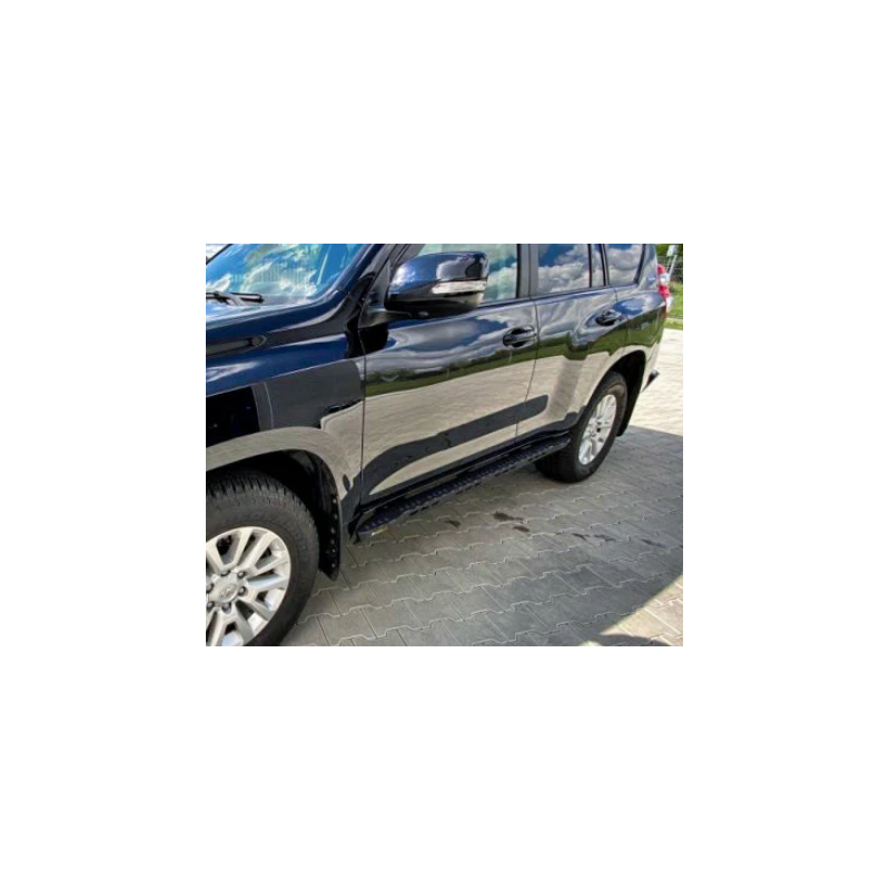 Reinforced metal (steel) side steps/rock sliders for Toyota Land Cruiser Prado J150 (can be adapted to fit Lexus GX 460) 2013-2017 (1st facelift). Step Sliders allow to lift your car with Hi-Lift jacks. Step Sliders protect your car from branches, rocks and other obstacles. Step Sliders also help to get in and get out of the car, perforated surface protects from slipping.