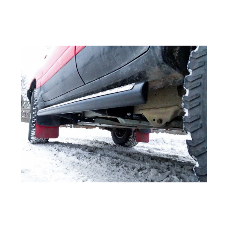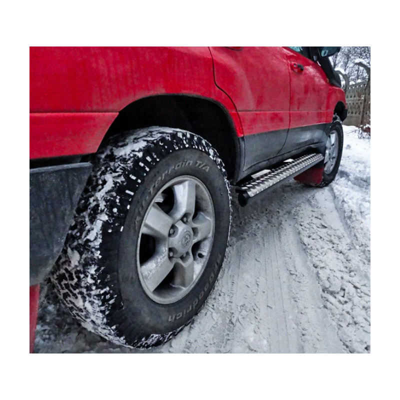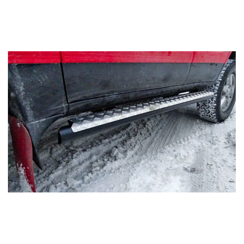 Reinforced metal (steel) side steps/rock sliders for Toyota Land Cruiser 100, Lexus LX 470 1998-2007. Step Sliders allow to lift your car with Hi-Lift jacks. Step Sliders protect your car from branches, rocks and other obstacles. Step Sliders also help to get in and get out of the car, rifled aluminum surface protects from slipping.