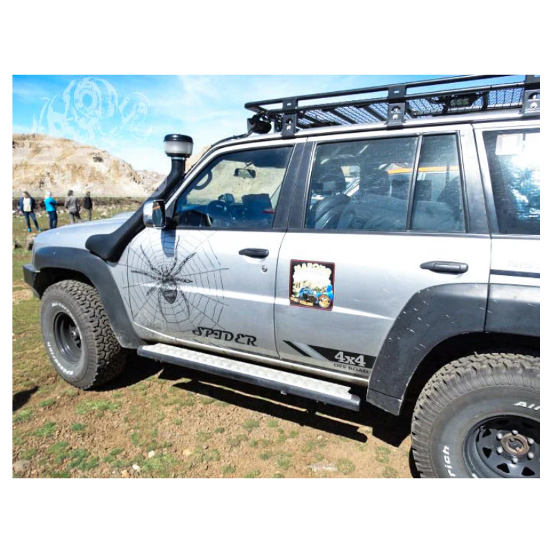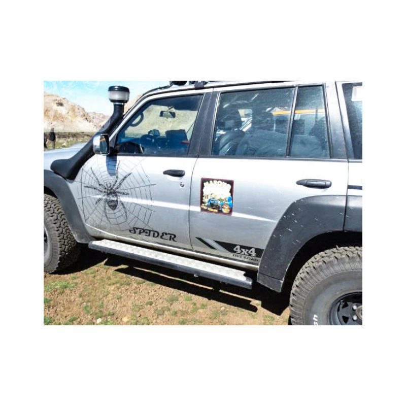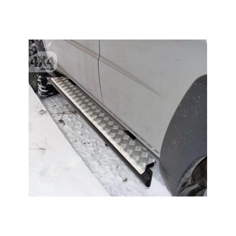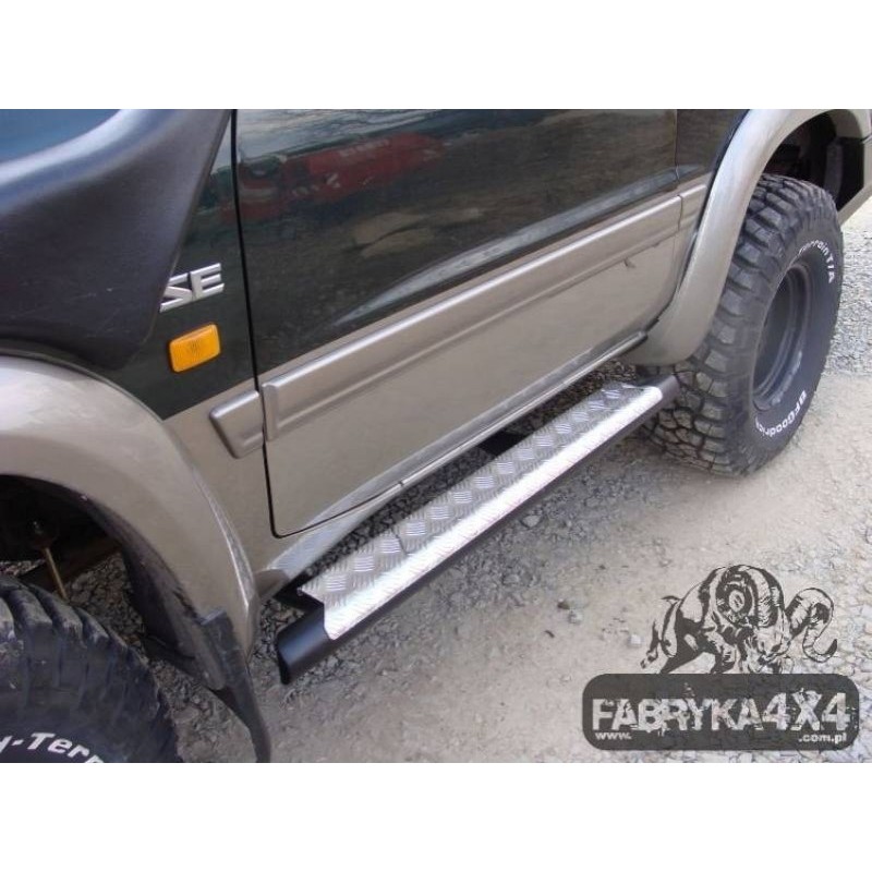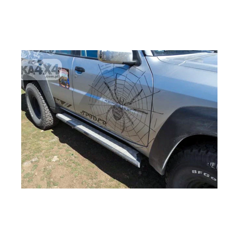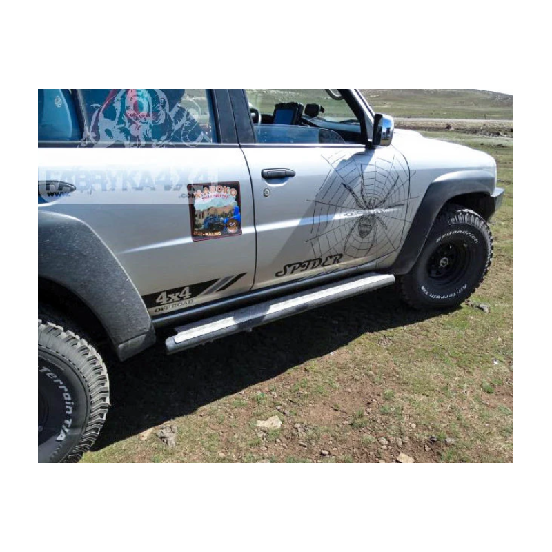 Reinforced metal (steel) side steps/rock sliders for Nissan Patrol Y61 GU4 2004-2024. Step Sliders allow to lift your car with Hi-Lift jacks. Step Sliders protect your car from branches, rocks and other obstacles. Step Sliders also help to get in and get out of the car, rifled aluminum surface protects from slipping.