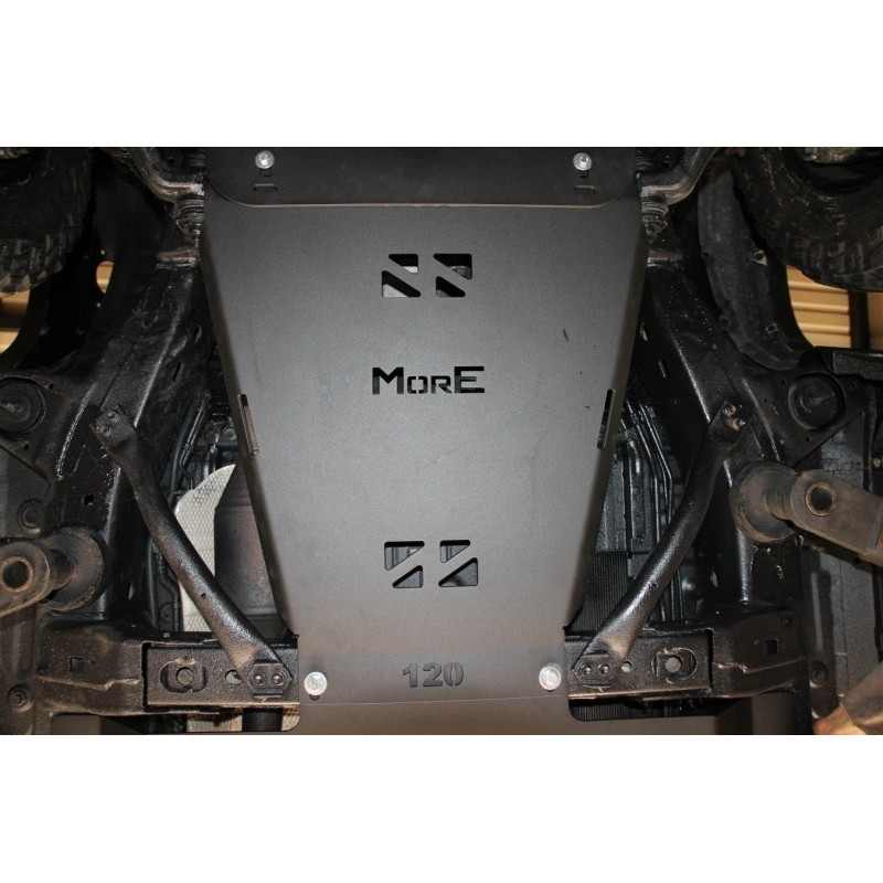 Toyota Land Cruiser Prado J120, J125 (su dyzeliniu varikliu), greičių dėžės apsauga "More4x4". Galima pritaikyti benzininiams ir Lexus GX 470 su tam tikrais pakeitimais.