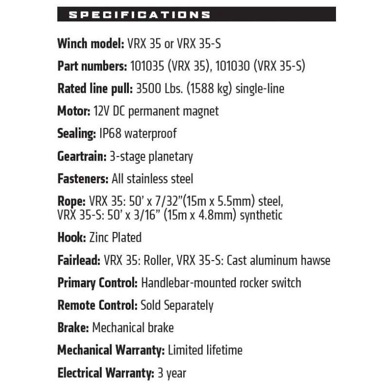 Warn VRX 35-S (3500 lbs) gervė skirta keturračiams motociklams, ATV, UTV. Gervė turi laisvos sankabos jungiklį, skirtą greitam lyno išvyniojimui. Gervės korpusas pagamintas iš tvirto plieno, kuris užtikrina maksimalų tvirtumą, ilgaamžiškumą ir patikimumą. Gervė turi IP68 atsparumo standartą.