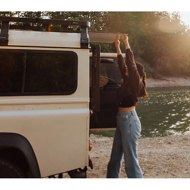 Bagažinės išilginiuose tvirtinimuose yra angos, kuriose galima laikyti po bagažine montuojamus „Front Runner“ stalus. Šiai bagažinei tinka 1 mažesnis arba 1 didesnis stalas.