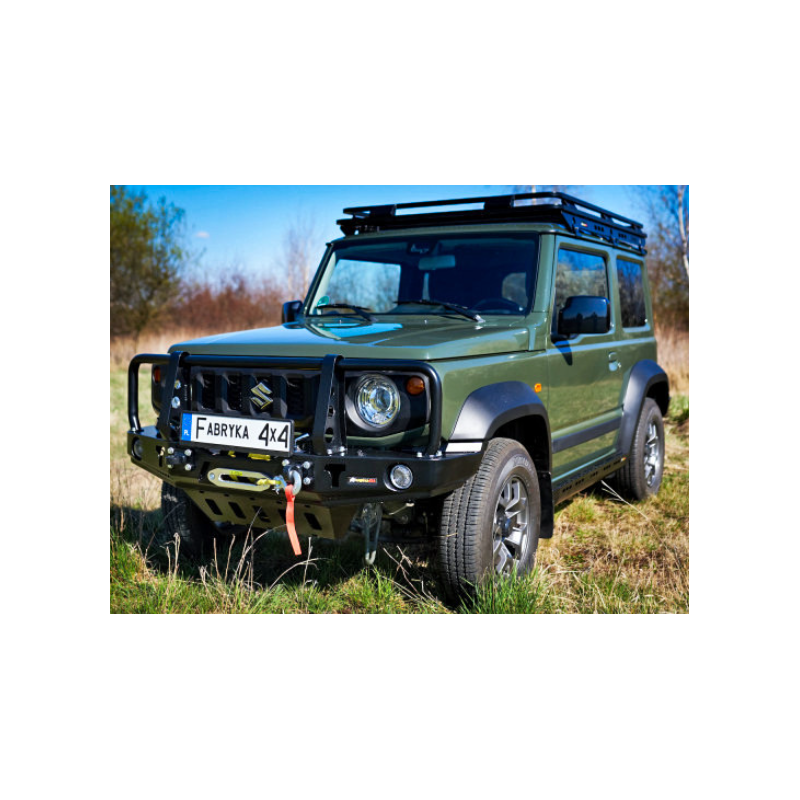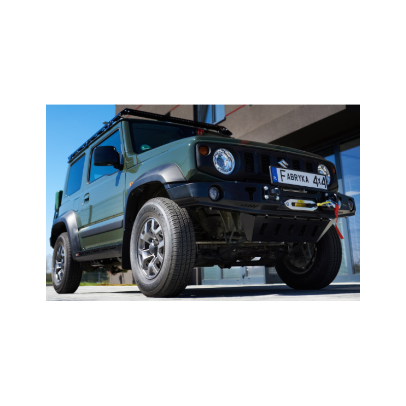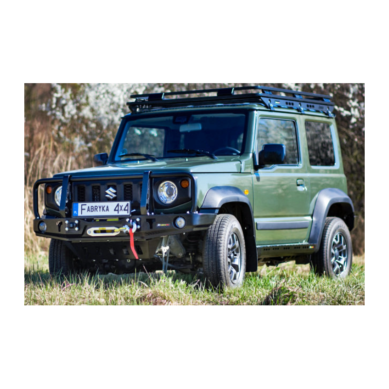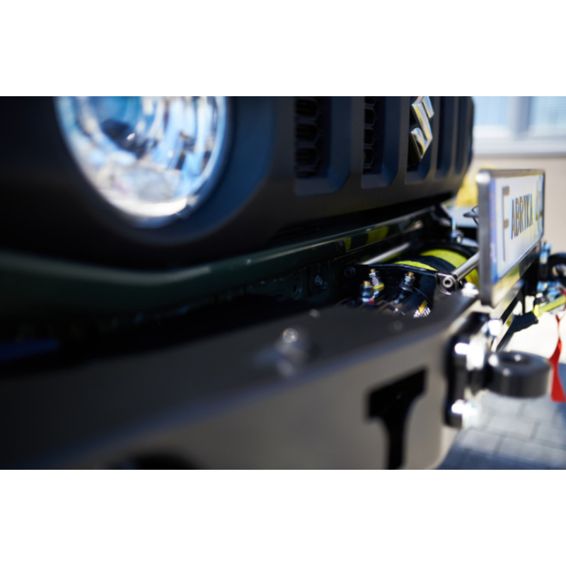 Metalinis priekinis bamperis su vieta gervei visureigiui Suzuki Jimny JB74W/JC74W 2018-. Bamperis gali būti komplektuojamas su prisukamais saugos lankais.