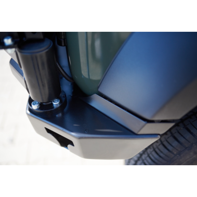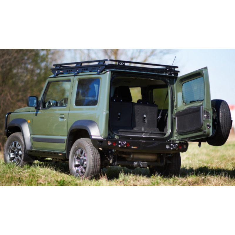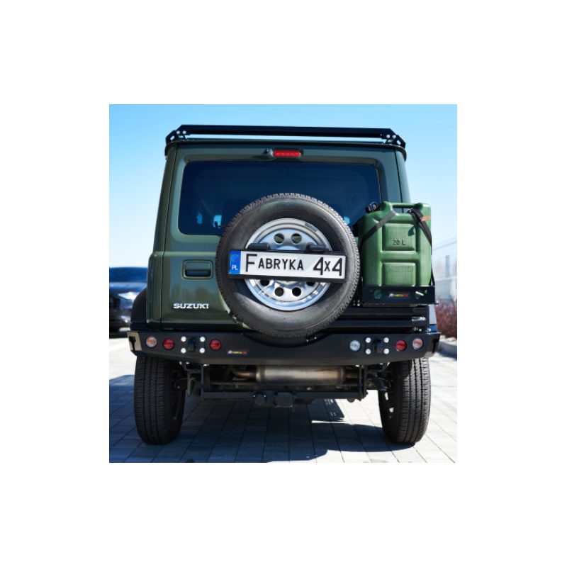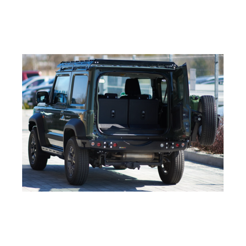 Metalinis galinis bamperis visureigiui Suzuki Jimny JB74W/JC74W 2018-. Bamperis turi montažines angas ąsų laikikliams prisukti, taip pat angas keltuvui Hi-Lift užkabinti ir papildomiems stabdžių, rūko ar atbulinės eigos žibintams montuoti (asų laikikliai ir žibintai komplektuojami už papildomą kainą). Bamperis dešiniajame kampe turi angas varstomam laikikliui prisukti (užsakoma atskirai).