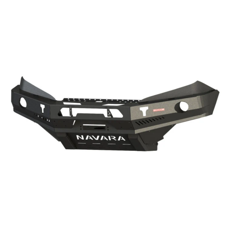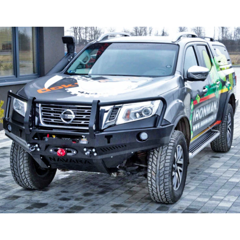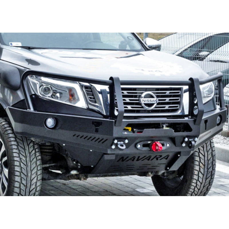 Metalinis priekinis bamperis su vieta gervei visureigiui Nissan Navara/NP300 D23 2014-. Bamperis gali būti komplektuojamas su prisukamais saugos lankais.