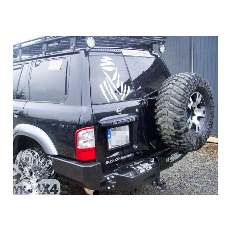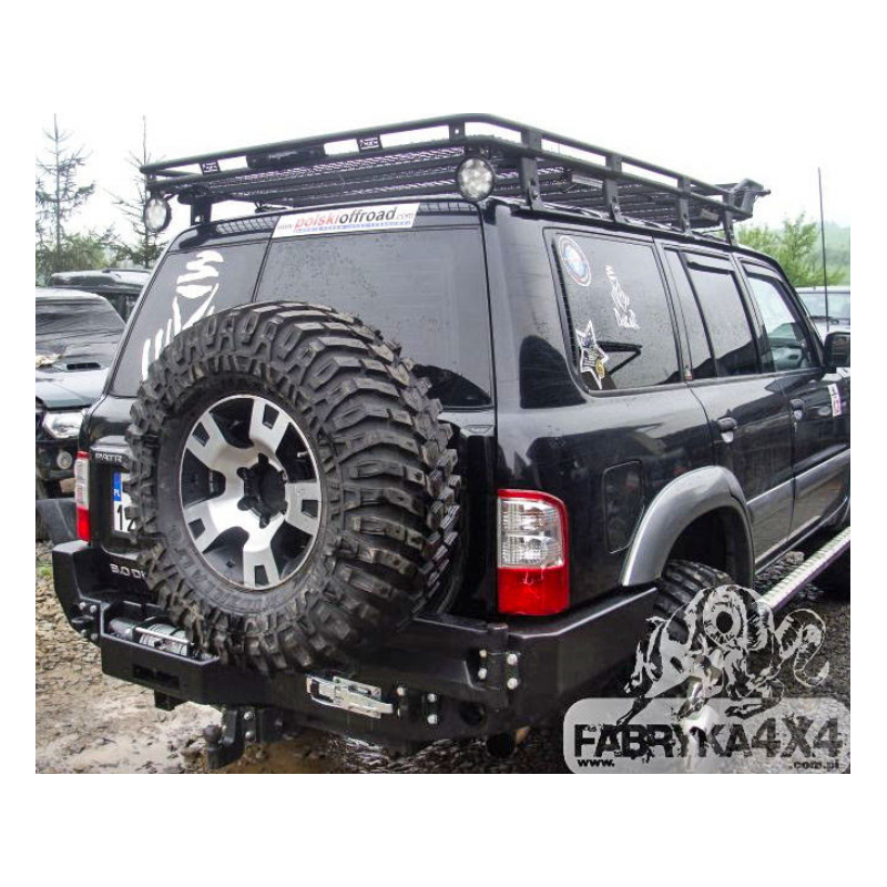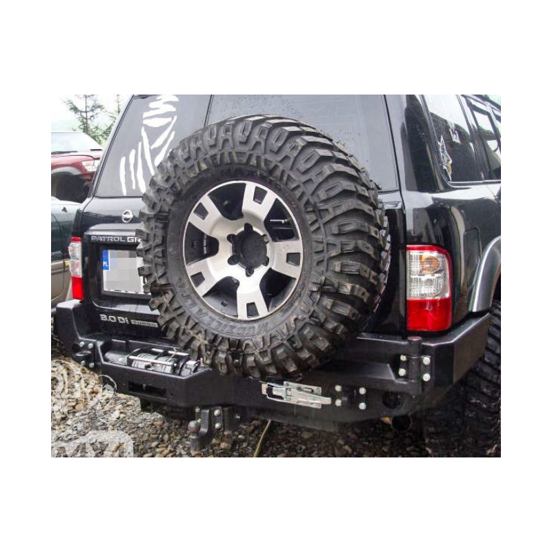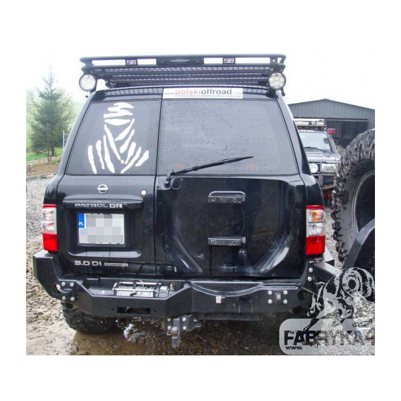 Metalinis galinis bamperis visureigiui Nissan Patrol Y61 GU-GU4 1997-2024. Bamperis turi montažines angas ąsų laikikliams prisukti ir angas keltuvui Hi-Lift užkabinti (asų laikikliai komplektuojami už papildomą kainą).