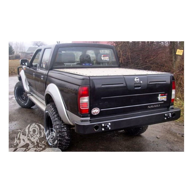 Metalinis galinis bamperis visureigiui Nissan Navara/NP300/PickUp/Frontier/Hardbody D22 2001-2004 (facelift). Bamperis turi angas keltuvui Hi-Lift užkabinti ir montažines angas ąsų laikikliams prisukti (asų laikikliai komplektuojami už papildomą kainą).