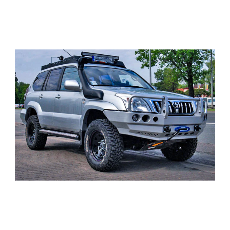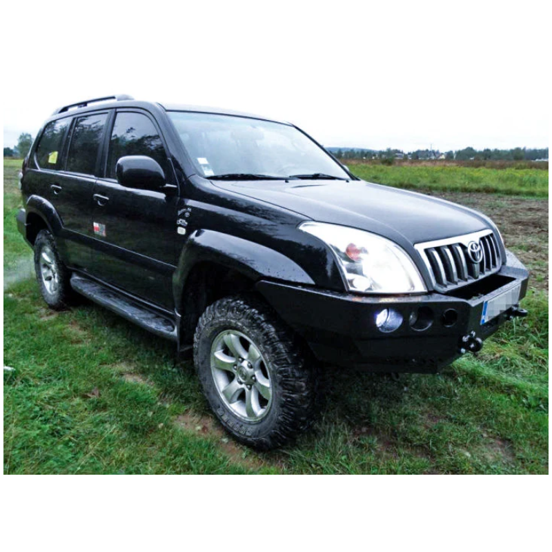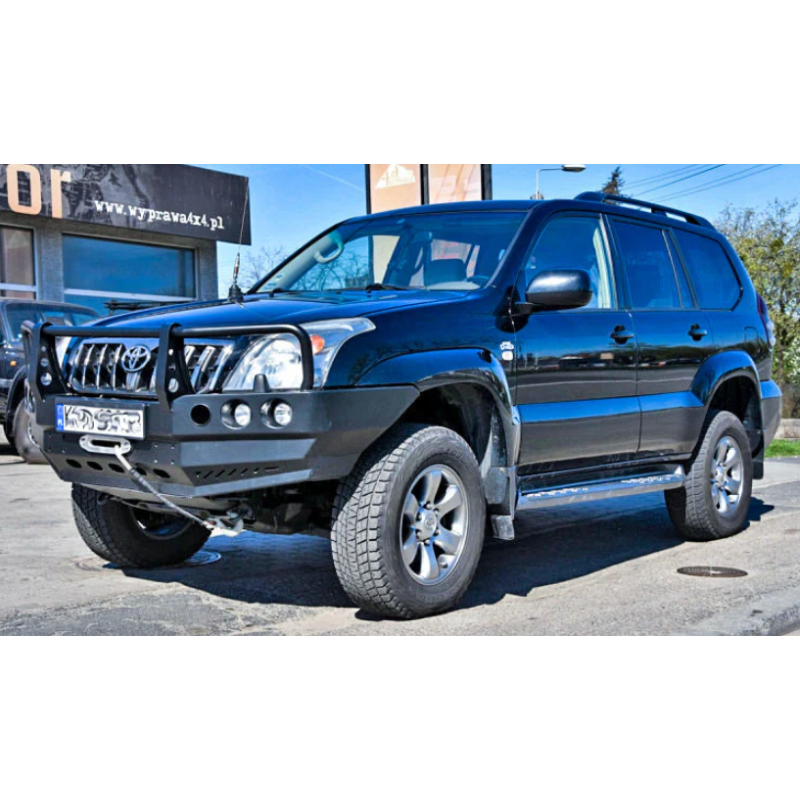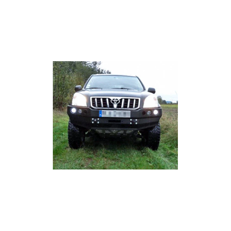 Metalinis priekinis bamperis su vieta gervei visureigiui Toyota Land Cruiser Prado J120, J125 (pritaikomas Lexus GX 470) 2002-2009. Bamperis gali būti komplektuojamas su prisukamais saugos lankais.