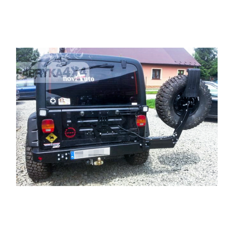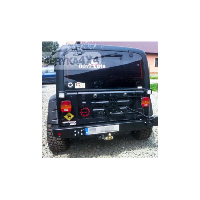Metalinis galinis bamperis visureigiui Jeep Wrangler TJ/LJ 1997-2006. Bamperis turi montažines angas ąsų laikikliams prisukti, taip pat angas papildomiems stabdžių, rūko ar atbulinės eigos žibintams montuoti (asų laikikliai ir žibintai komplektuojami už papildomą kainą).