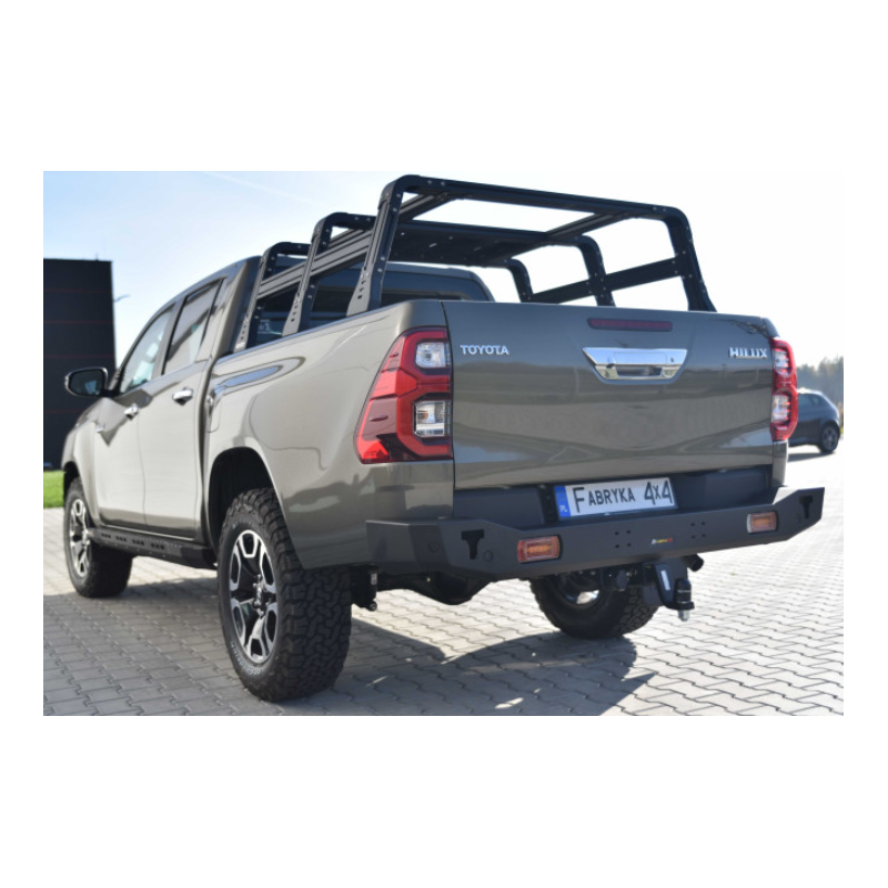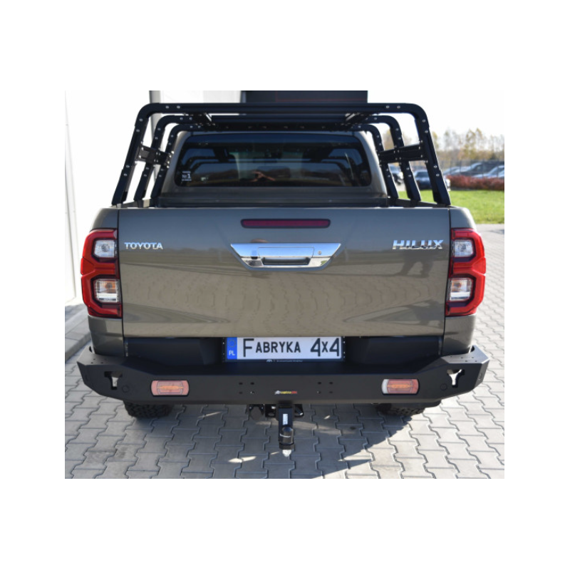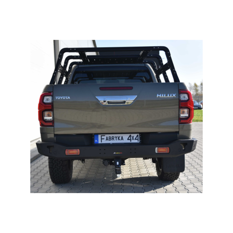 Metalinis trumpas galinis bamperis visureigiui Toyota Hilux Revo AN110, AN120, AN130 2020- (2nd facelift). Bamperis yra su priekabos sukabinimo lizdu ir tvirtinimu priekabos kištukiniam lizdui.