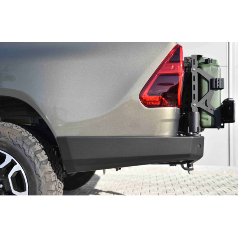 Metalinis ilgas galinis bamperis visureigiui Toyota Hilux Revo AN110, AN120, AN130 2020- (2nd facelift). Bamperis yra su priekabos sukabinimo lizdu ir tvirtinimu priekabos kištukiniam lizdui.