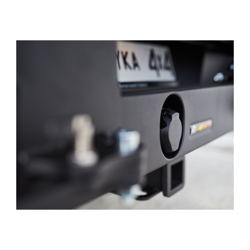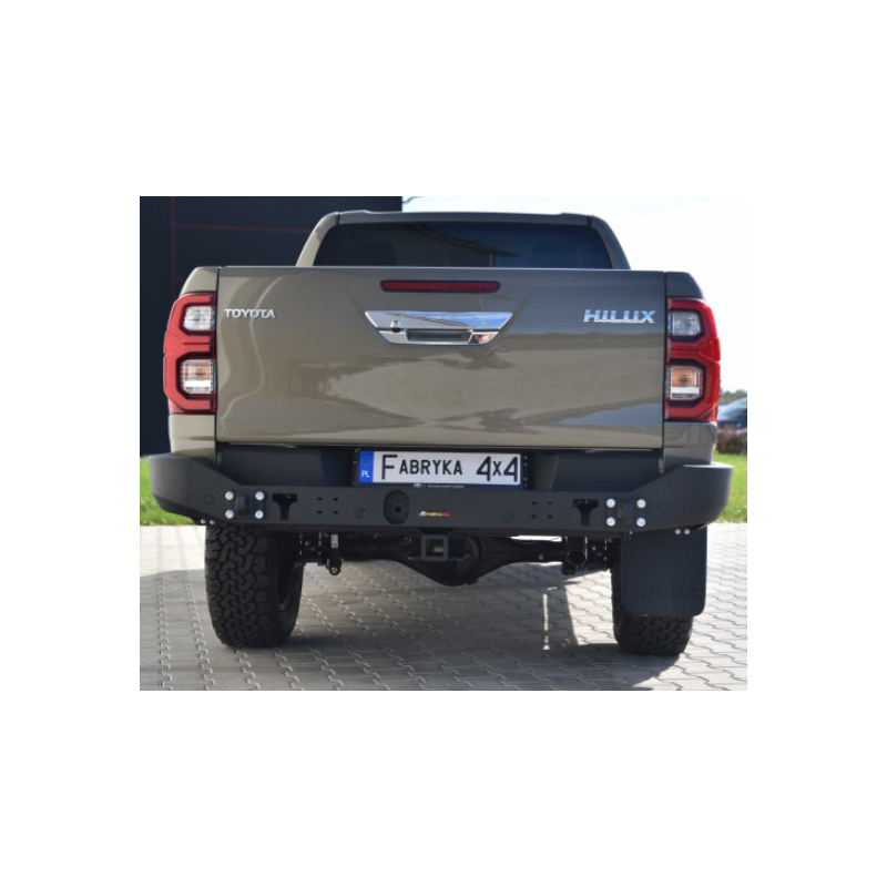 Metalinis ilgas galinis bamperis visureigiui Toyota Hilux Revo AN110, AN120, AN130 2020- (2nd facelift). Bamperis yra su priekabos sukabinimo lizdu ir anga priekabos kištukiniam lizdui.