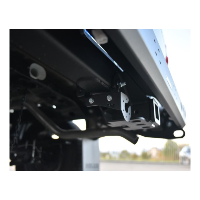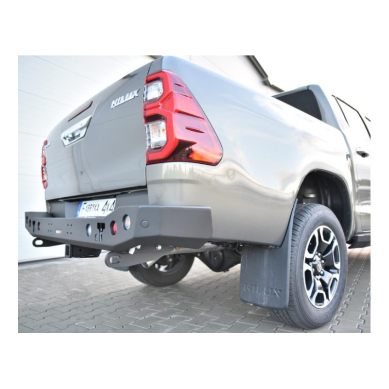Metalinis trumpas galinis bamperis visureigiui Toyota Hilux Revo AN110, AN120, AN130 2020- (2nd facelift). Bamperis yra su priekabos sukabinimo lizdu ir tvirtinimu priekabos kištukiniam lizdui.